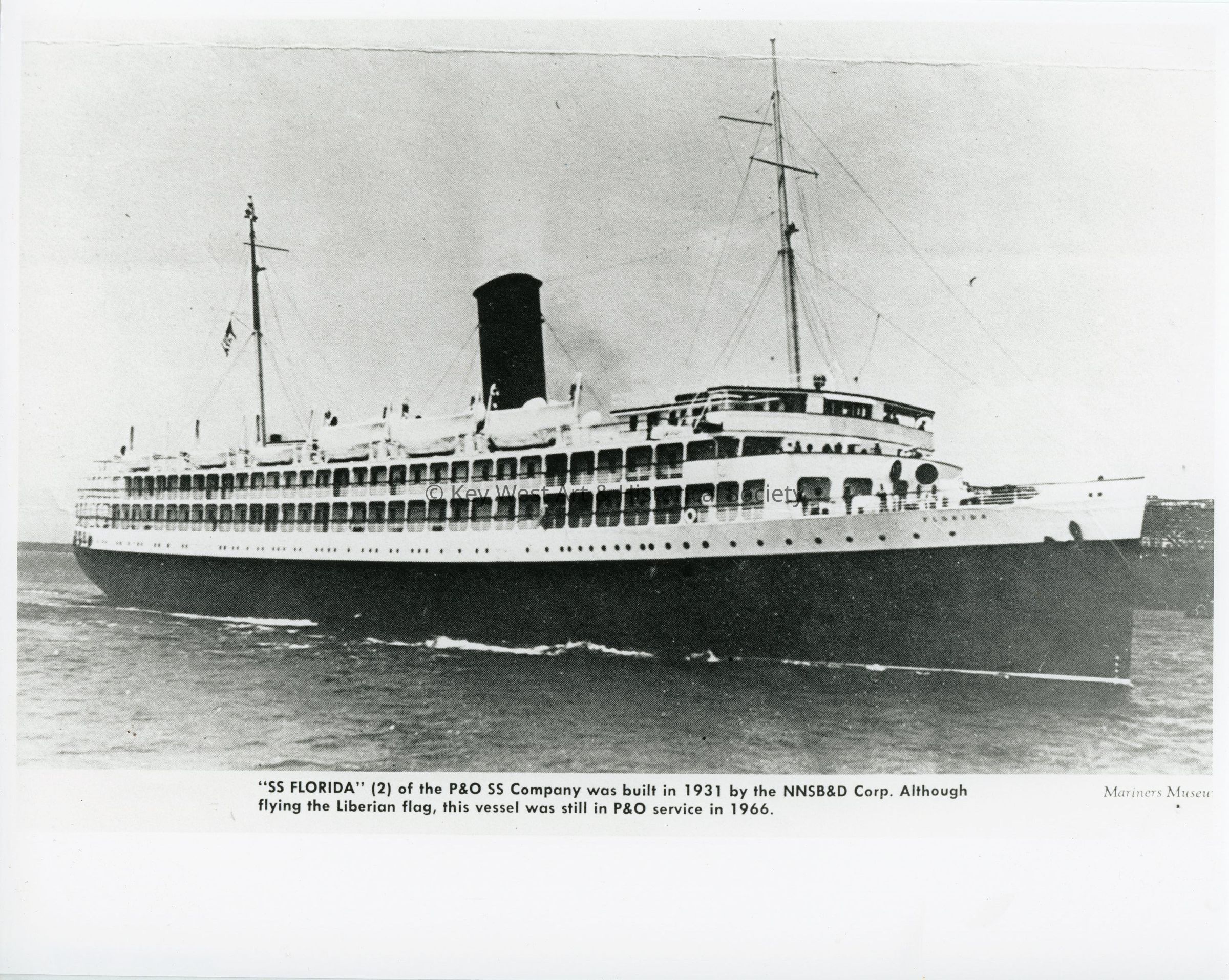 Black and white photograph of SS FLORIDA belonging to the P&O SS Company. It was built in 1931 by NNSB&D Corp. Although flying the Liberation flag, this vessel was still in P&O service in 1966.