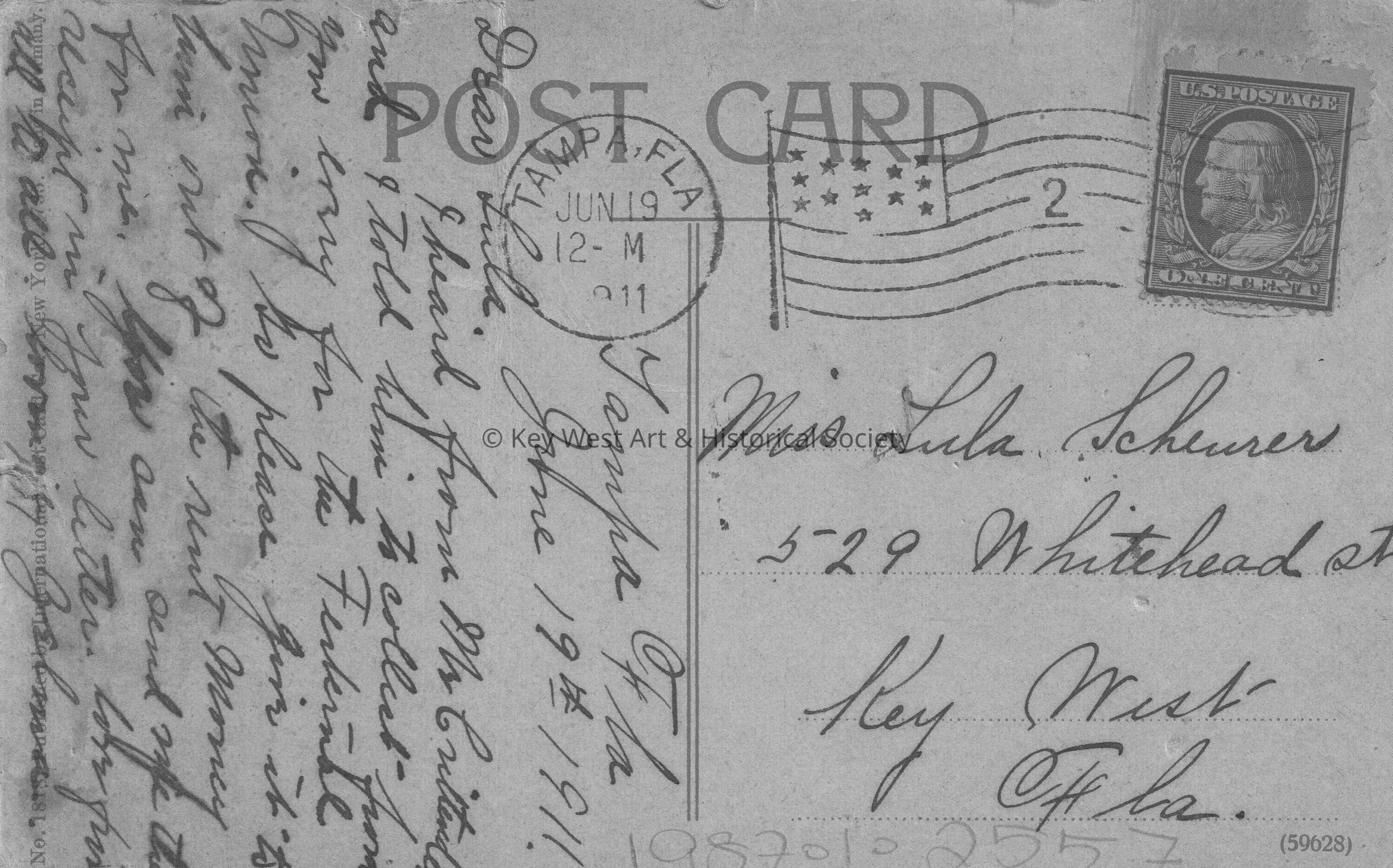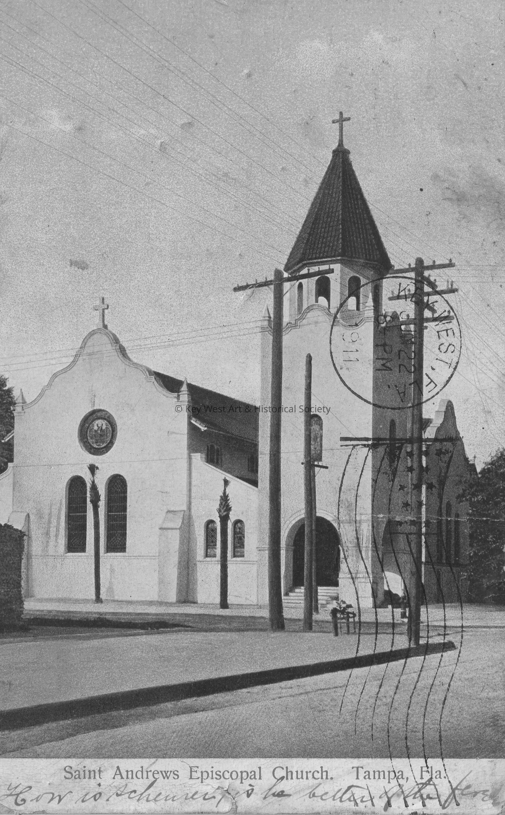 Postcard of a church. The caption reads, ‘St. Andrews Episcopal Church, Tampa, Florida.’ A note on the front reads, ‘How is Scheurer? Is he better off than before?’ The message on the verso reads, ‘Tampa, Florida, June 19th, 1911. Dear Lula, I heard from Mr. Crittenden and I told him to collect from you money for the Fraternal Union. So please give it to him out of the rent money for me. You can send me the receipt in your letter. Love from all to all. Lovingly, Zelma.’ The card is addressed to Miss Lula Scheurer, 529 Whitehead Street, Key West, Florida, and is postmarked Tampa, June 19, 1911, and Key West, June 22, 1911.Subject Place