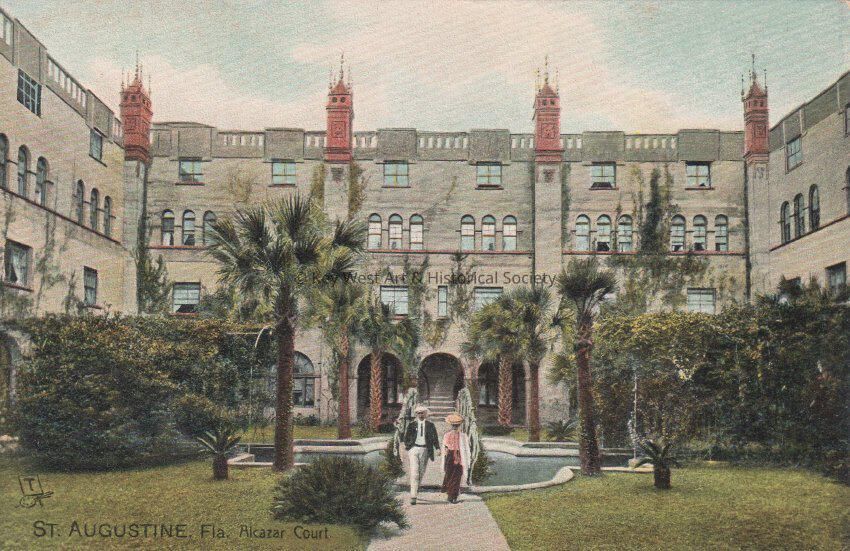 Postcard of a couple in front of a large hotel. The caption reads, ‘St. Augustine, Florida, Alcazar Court.’ The description on the verso reads, ‘The Alcazar Hotel, located on the south side of King Street is of Spanish-Moresque architecture, with a wealth of tropical foliage and beautiful fountains. The court surrounding the hotel is filled with magnificent royal palms, century plants, rubber trees, shrubs, blooming plants, rustic bridges and walks.’Collection