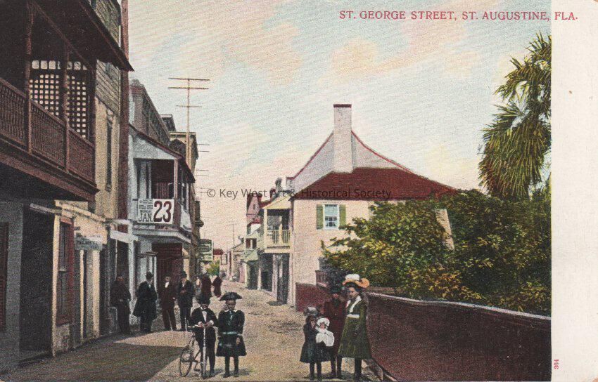 Postcard of children with a bicycle and a doll, and also a group of men standing on a street lined with buildings. The caption reads, ‘St. George Street, St. Augustine, Florida.’Collection