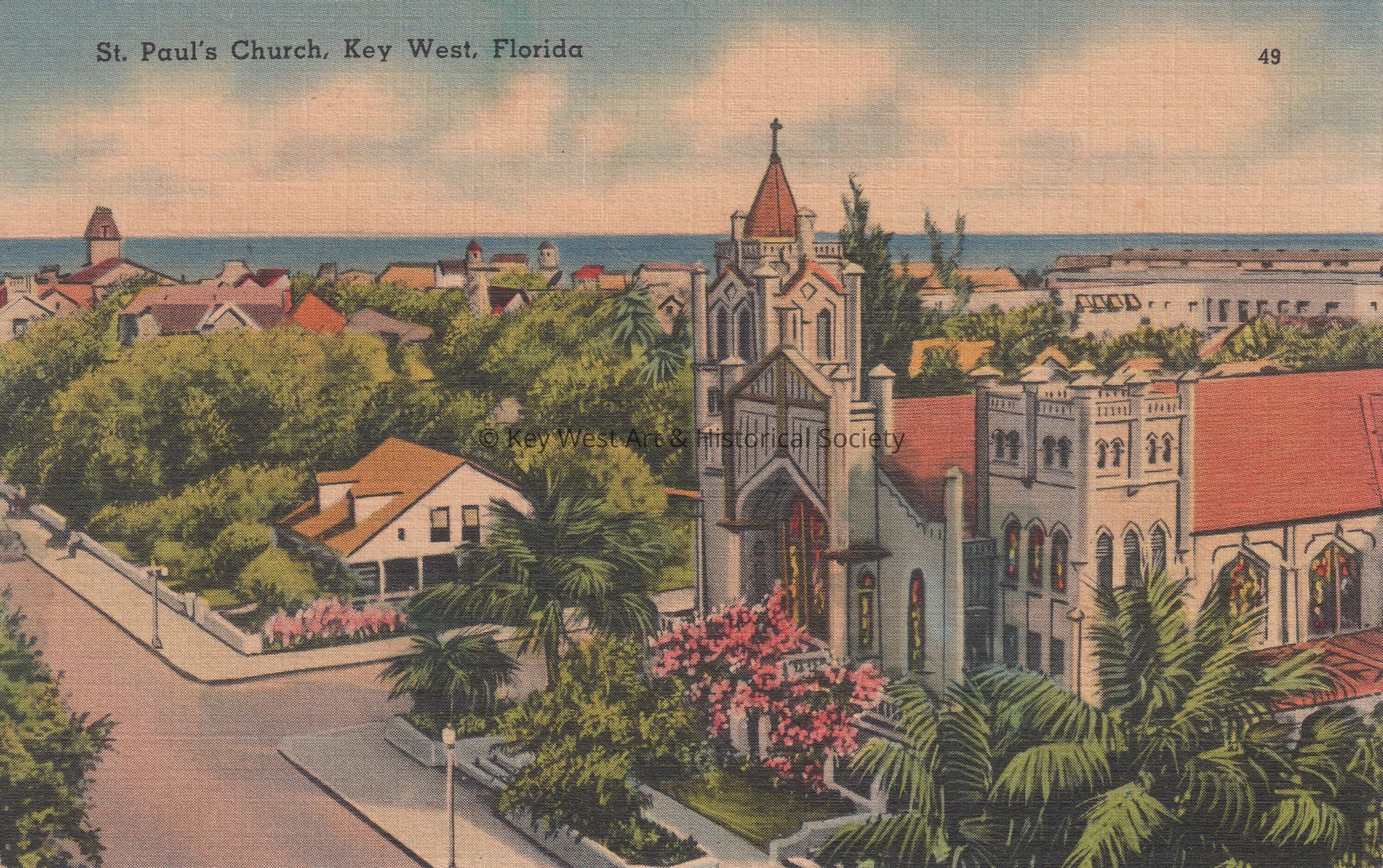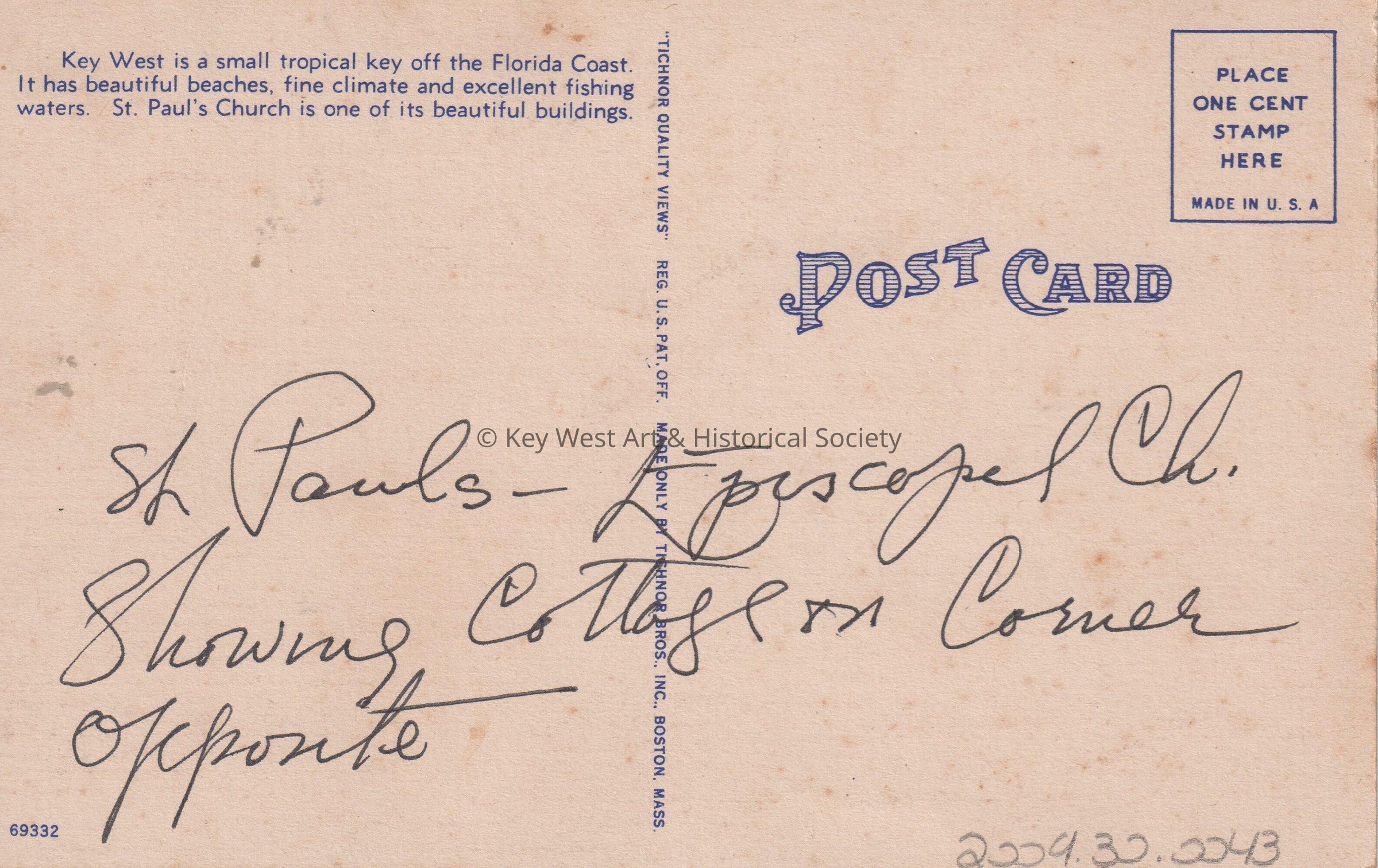 Postcard depicting a church, tropical foliage, homes, and the ocean in the background. The caption reads, ‘St. Paul’s Church, Key West, Florida.’ The description on the verso reads, ‘Key West is a small tropical key off the Florida Coast. It has beautiful beaches, fine climate and excellent fishing waters. St. Paul’s Church is one of its beautiful buildings.’ The message on the verso reads, ‘St. Paul’s Episcopal Church, showing cottage on corner opposite.’Subject Place