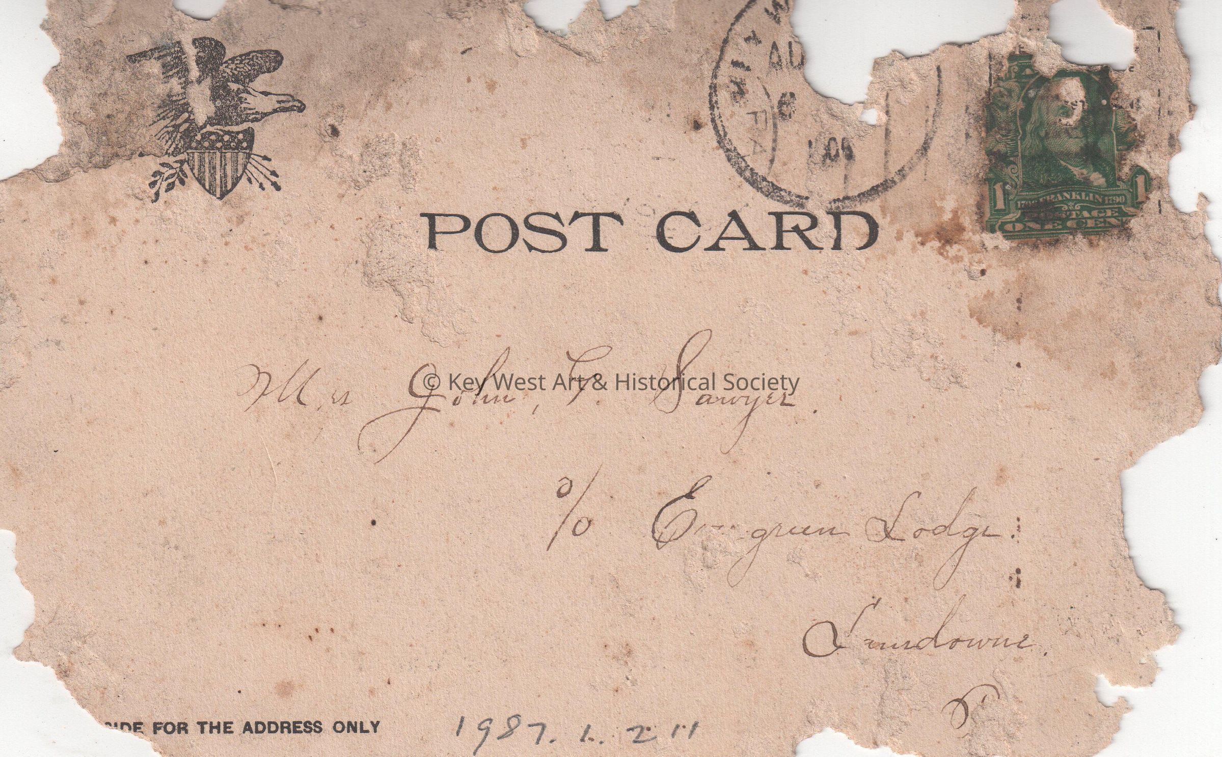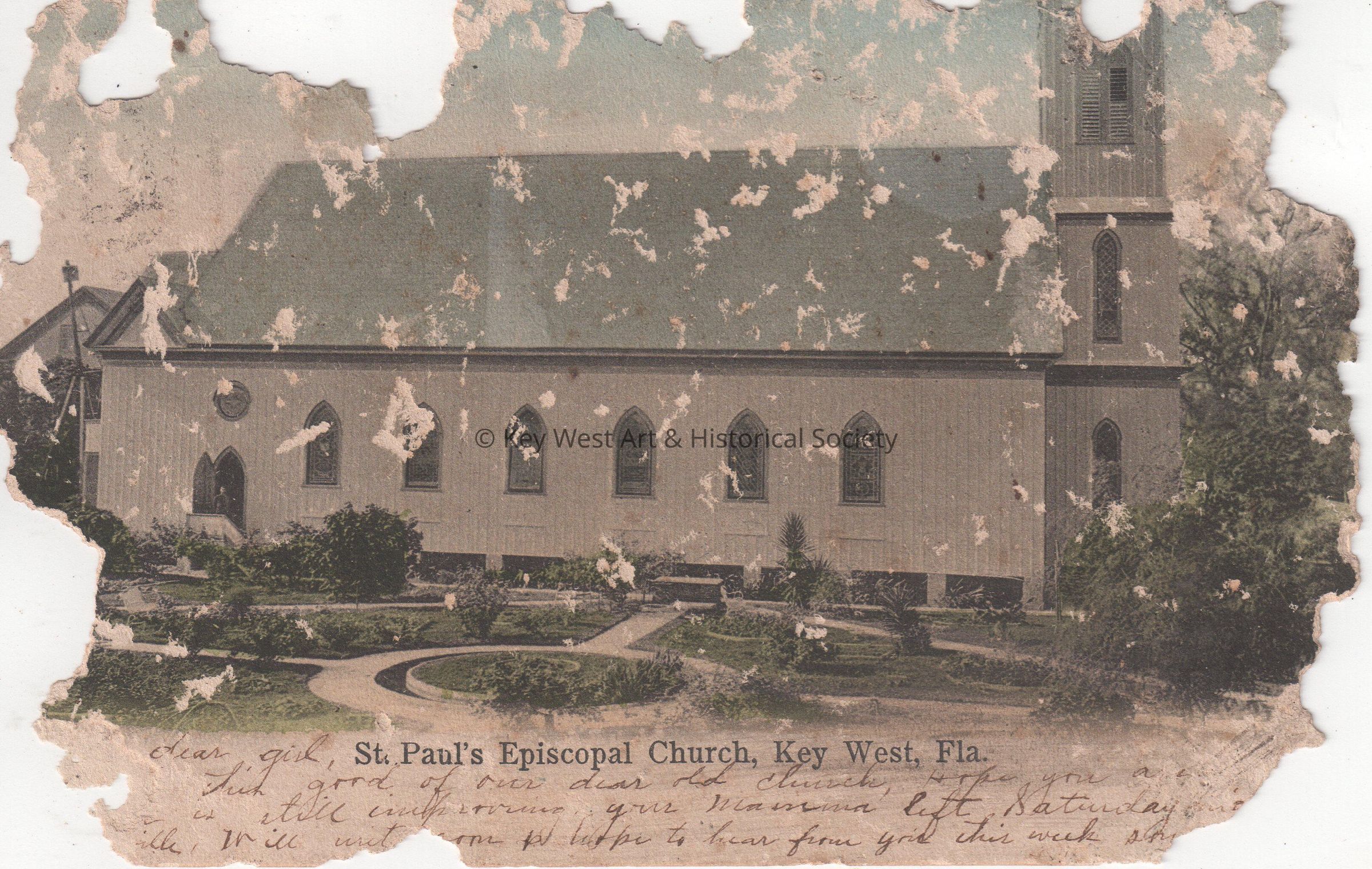 Postcard depicting a church and its garden. The caption reads, ‘St. Paul’s Episcopal Church, Key West, Florida.’ The message on the front reads, ‘Dear girl, Think good of our dear old Church. Hope your ___ is still improving. Your mamma left Saturday just ___. Will write you. We hope to hear from you this week.’ The card is addressed to Mrs. John G. Sawyer, c/o Evergreen Lodge, Lansdowne, Pennsylvania.Collection