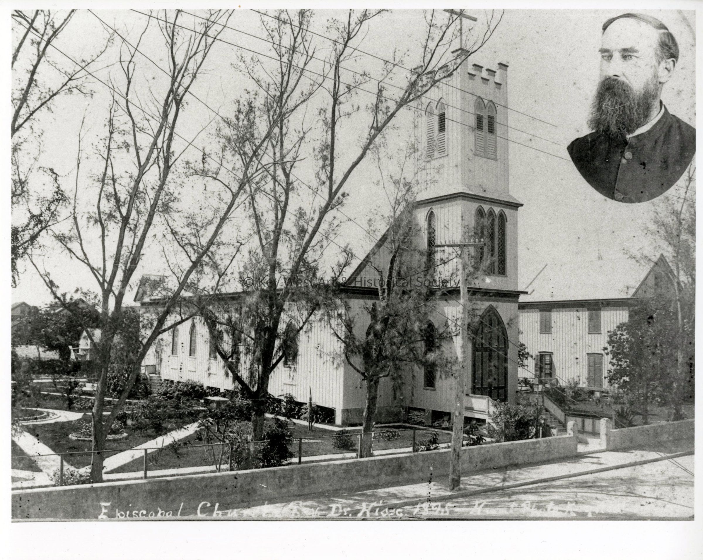 Black and white photograph of St. Paul's Episcopal Church with a vignette of Reverend Dr. Gilbert Higgs in the upper right corner.
