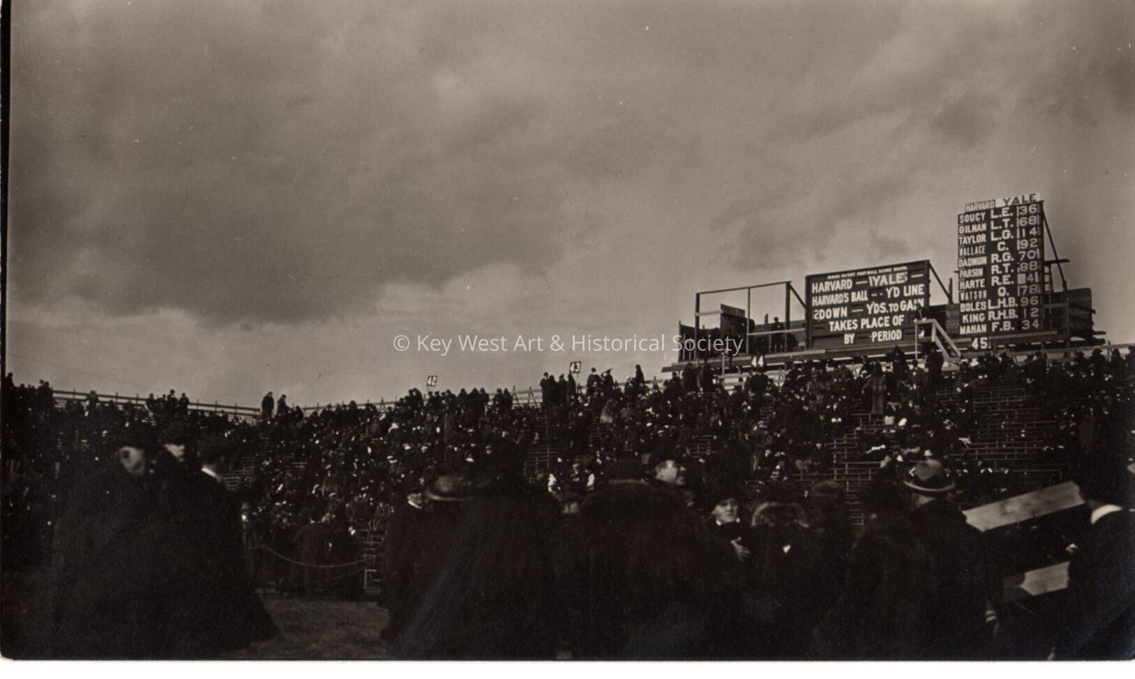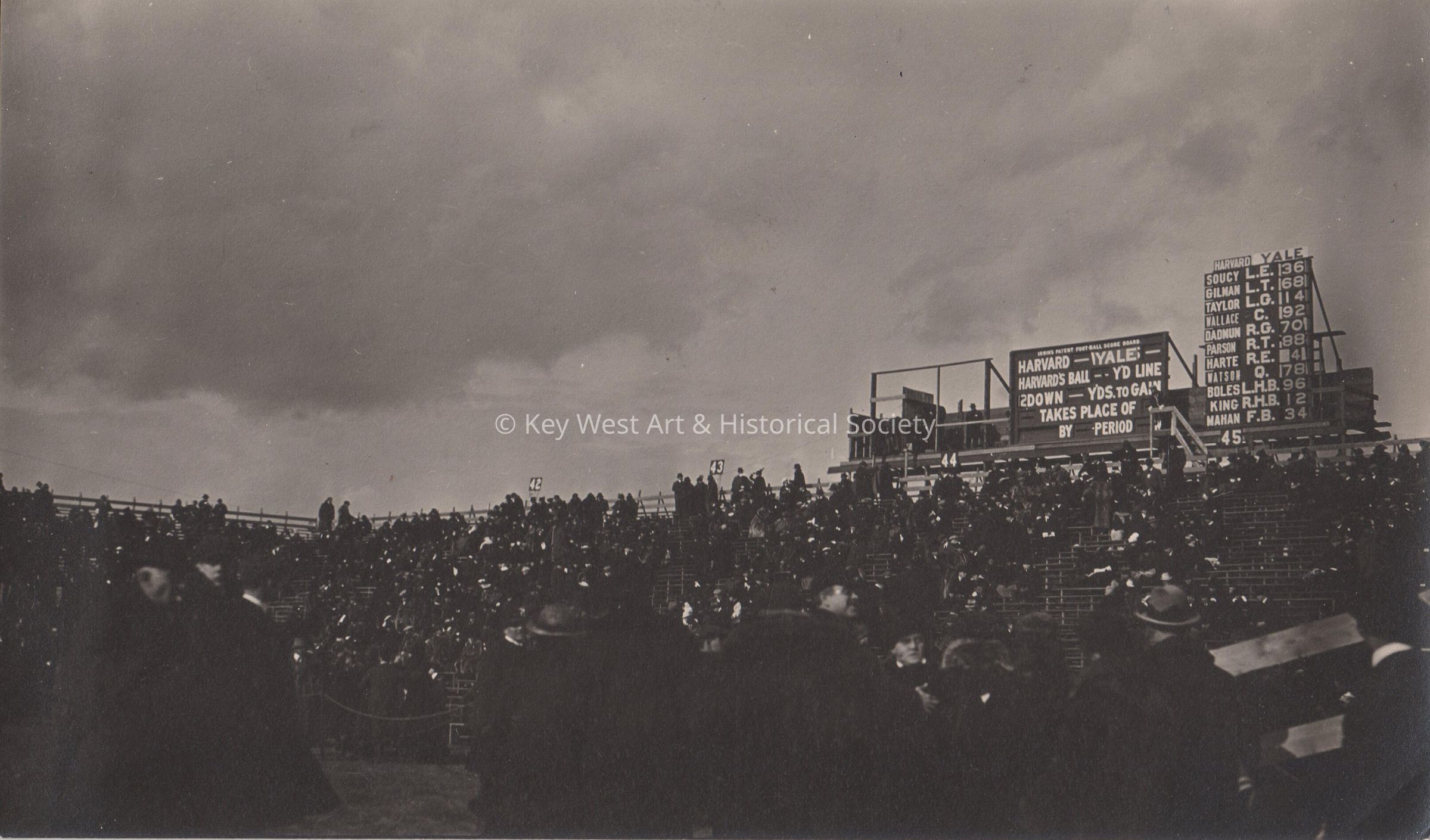 Black and white photograph of the scoreboard and stadium at a Harvard-Yale football game.Collection
