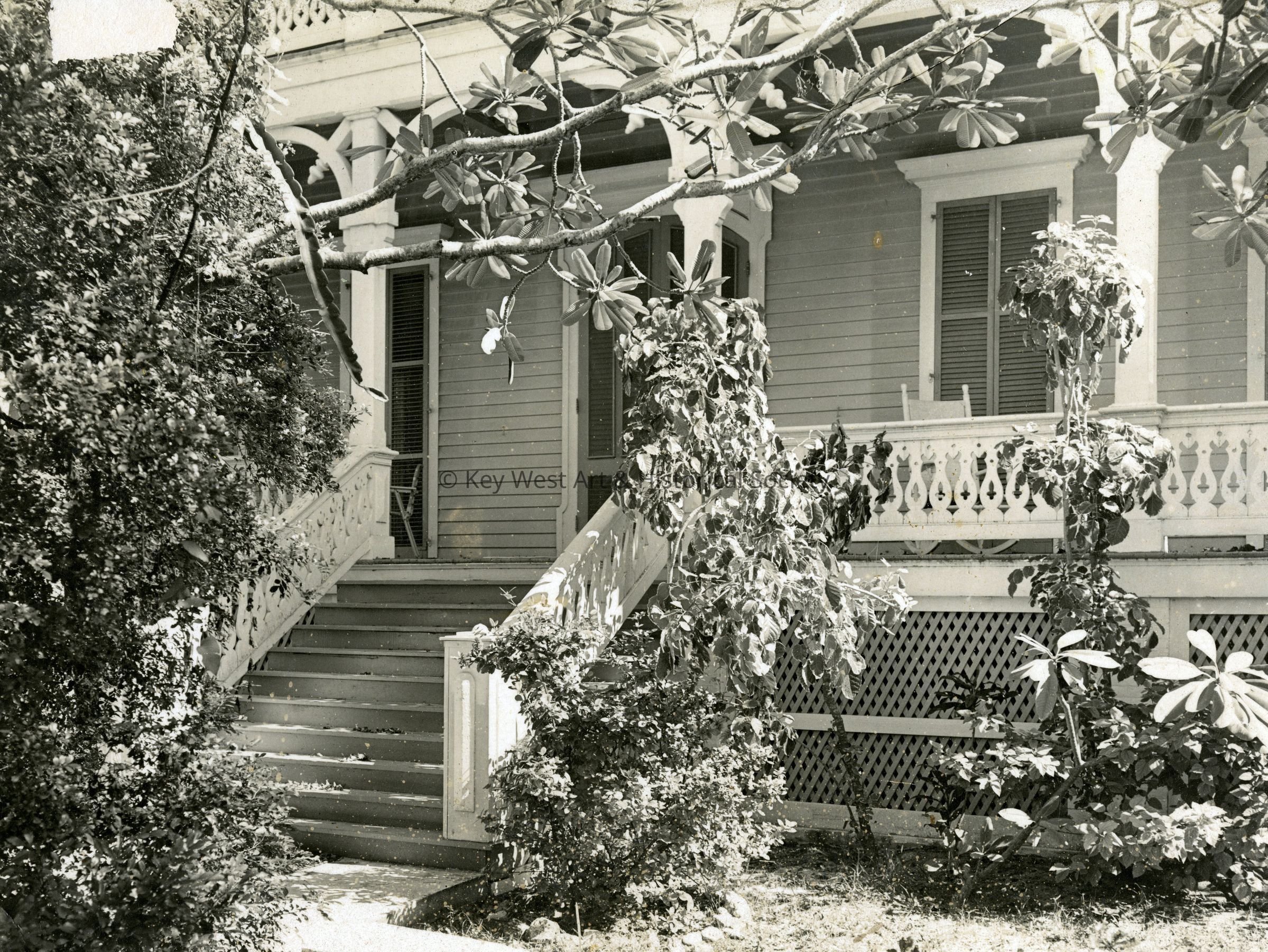 Black and white photograph of the staircase leading up to the Dr. Joseph Yates Porter House at 430 Caroline Street on the corner of Duval Street.