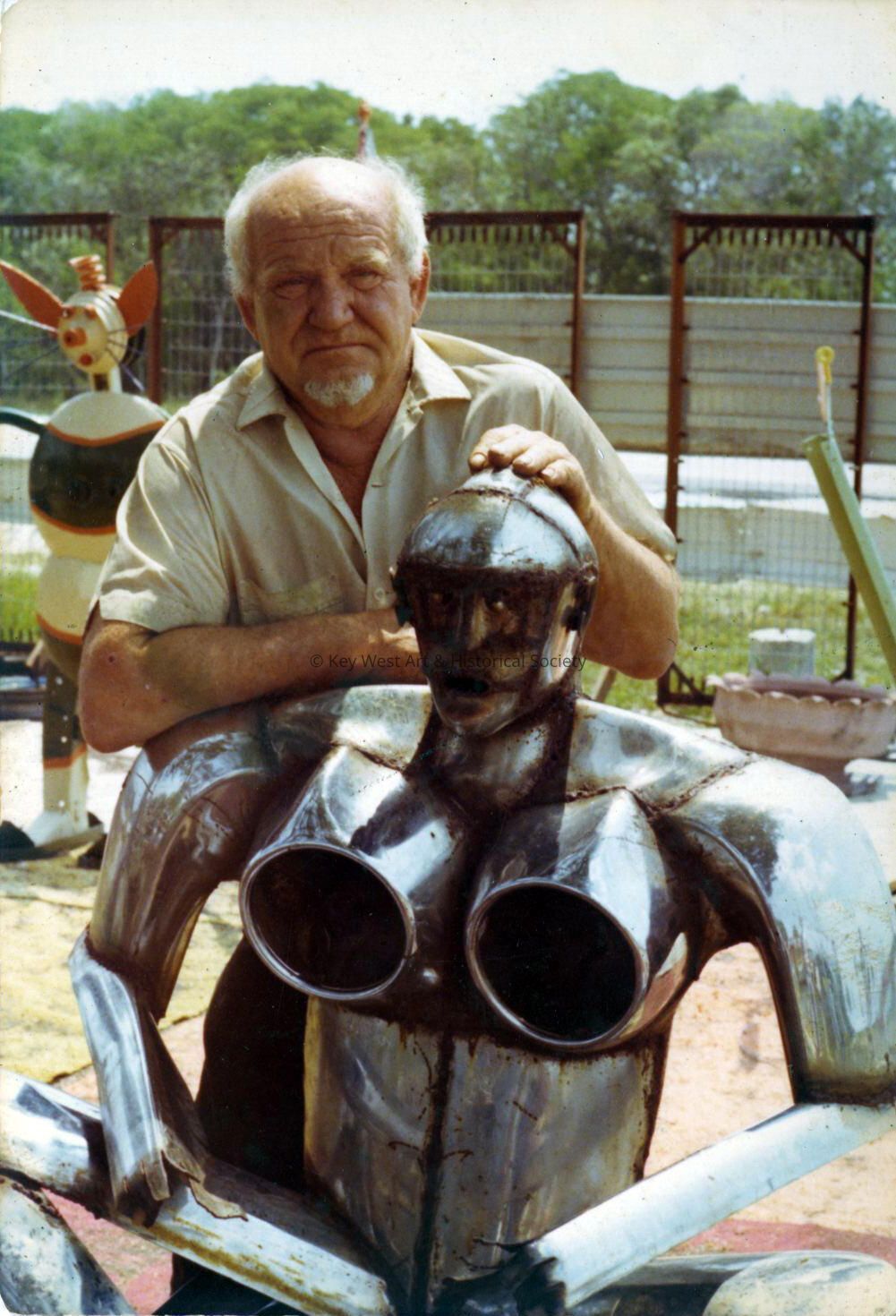 Color photograph of the Stanley Papio with one of his metal sculptures at his Folk Art Museum in Key Largo.