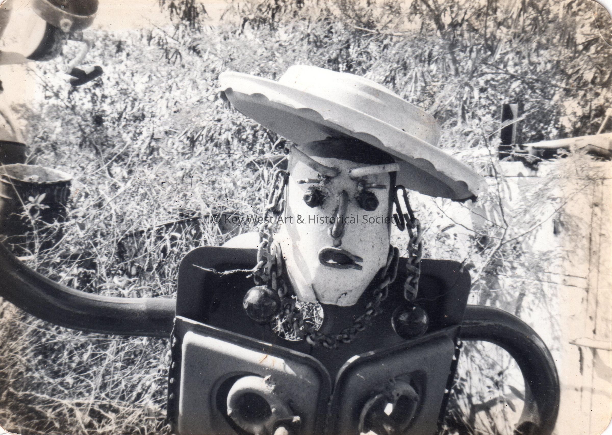 Black and white photograph of a Stanley Papio metal sculpture known as Dish Pan Annie taken on his property in Key Largo.