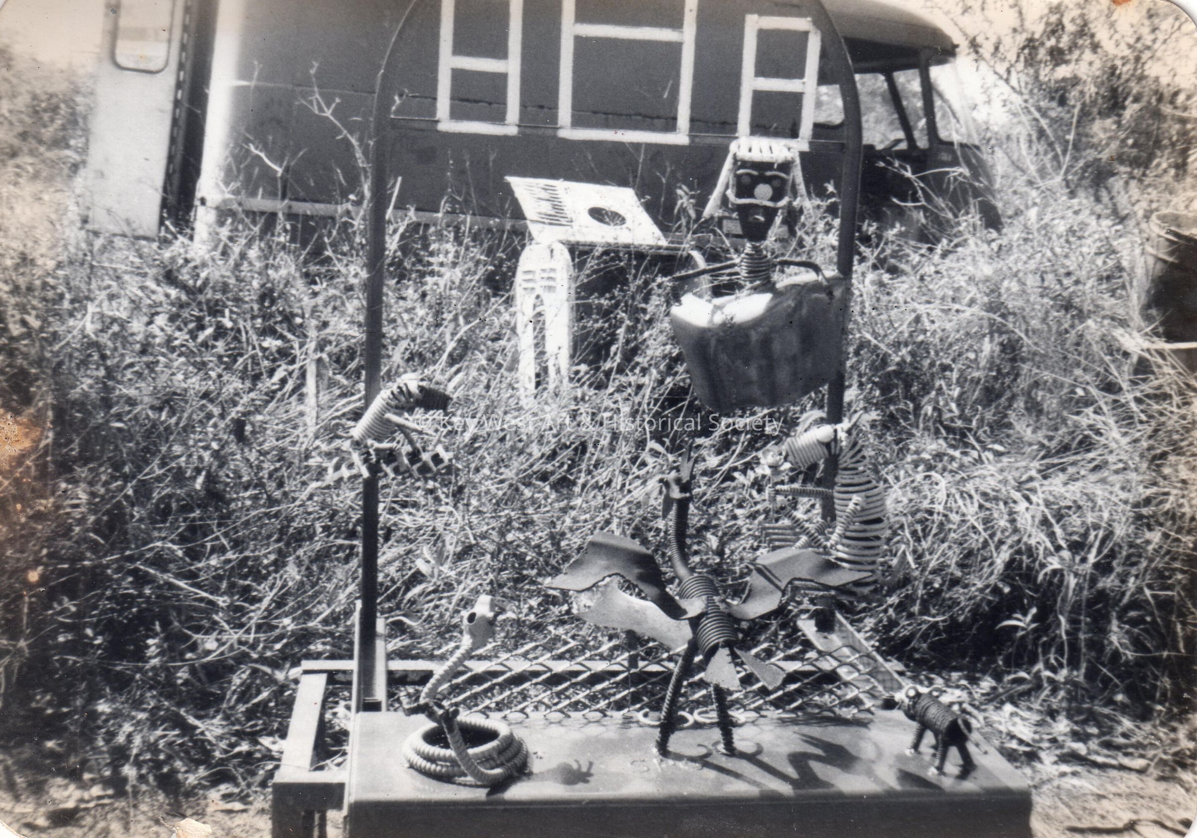 Black and white photograph of a Stanley Papio metal sculpture taken on his property in Key Largo.