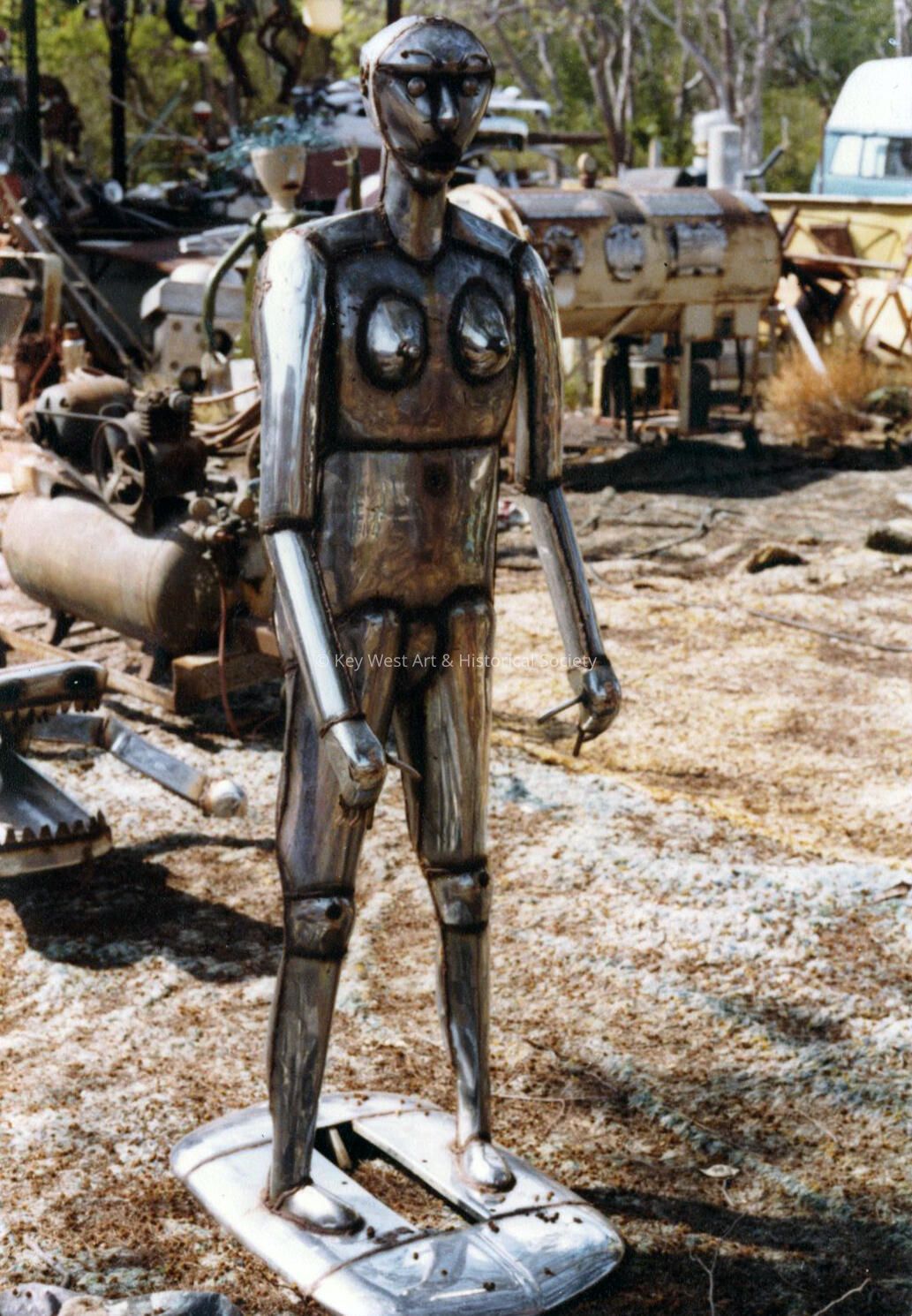 Color photograph of the Stanley Papio's Standing Chrome Female Figure sculpture taken at his Folk Art Museum in Key Largo.