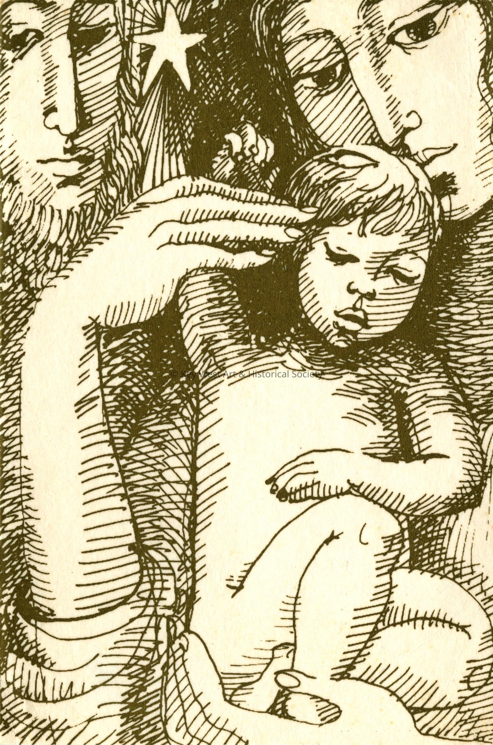 Greeting card designed by Suzie dePoo depicting the Holy Family. Printed for Key West Hand Print Papers, a division of Key West Hand Print Fabrics.