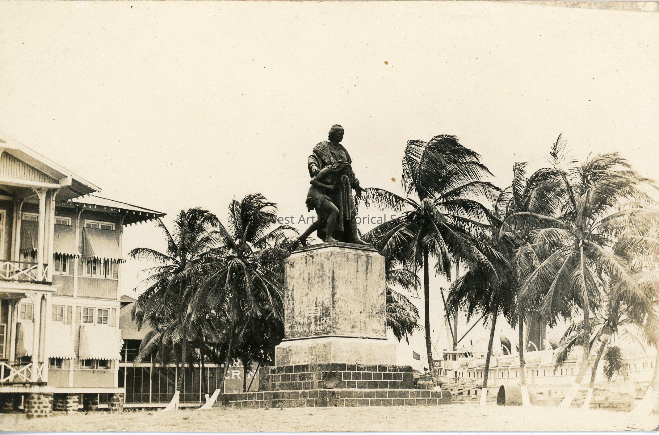 Black and white photograph postcard depicting a statue of Christopher Columbus holding an indigenous woman in the town of Cristobal, Panama.Subject