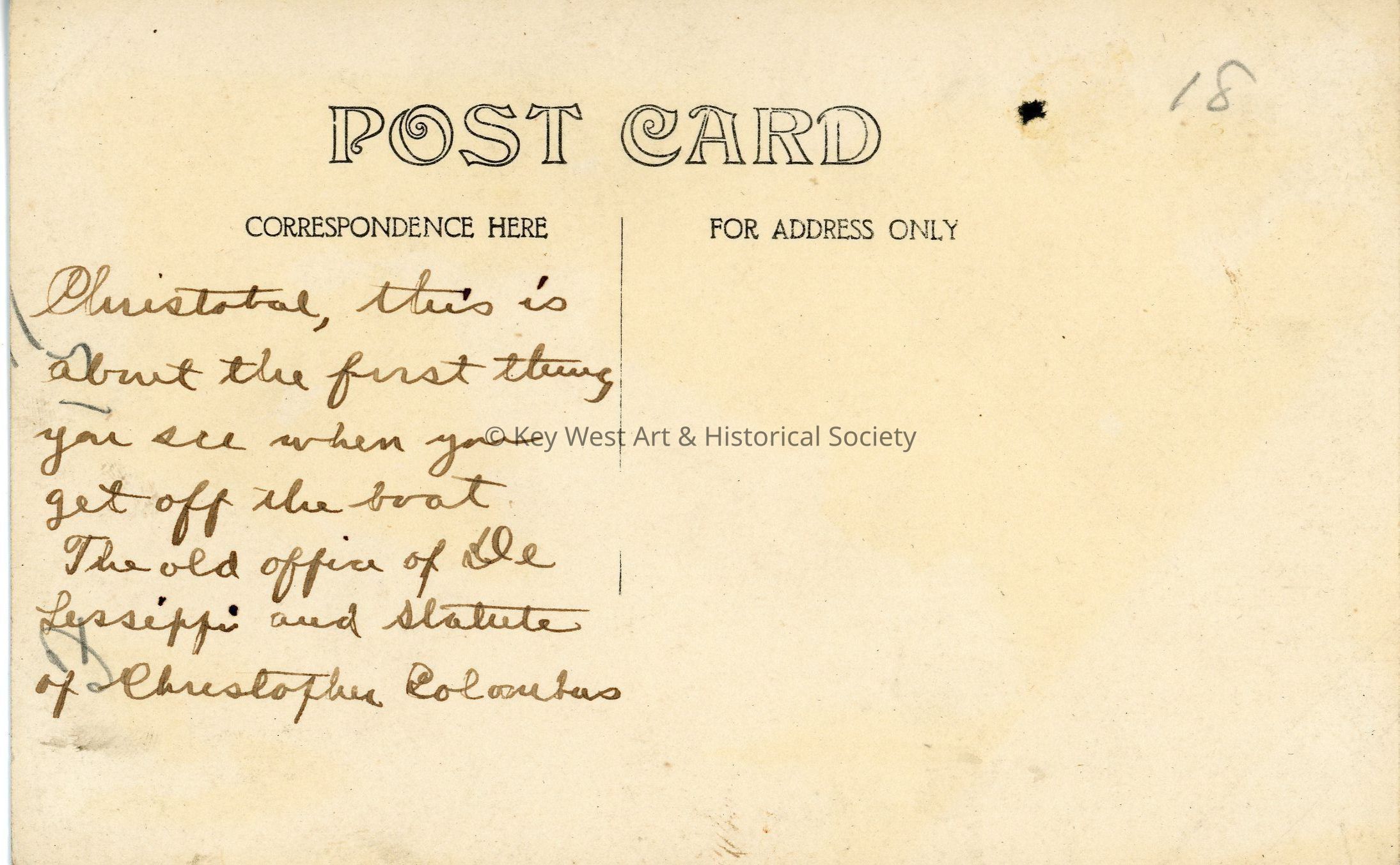 Christobal [sic], this is about the first thing you see when you get off the boat. The old office of De Lessippi [sic] and statute [sic] of Christopher ColumbusLanguage