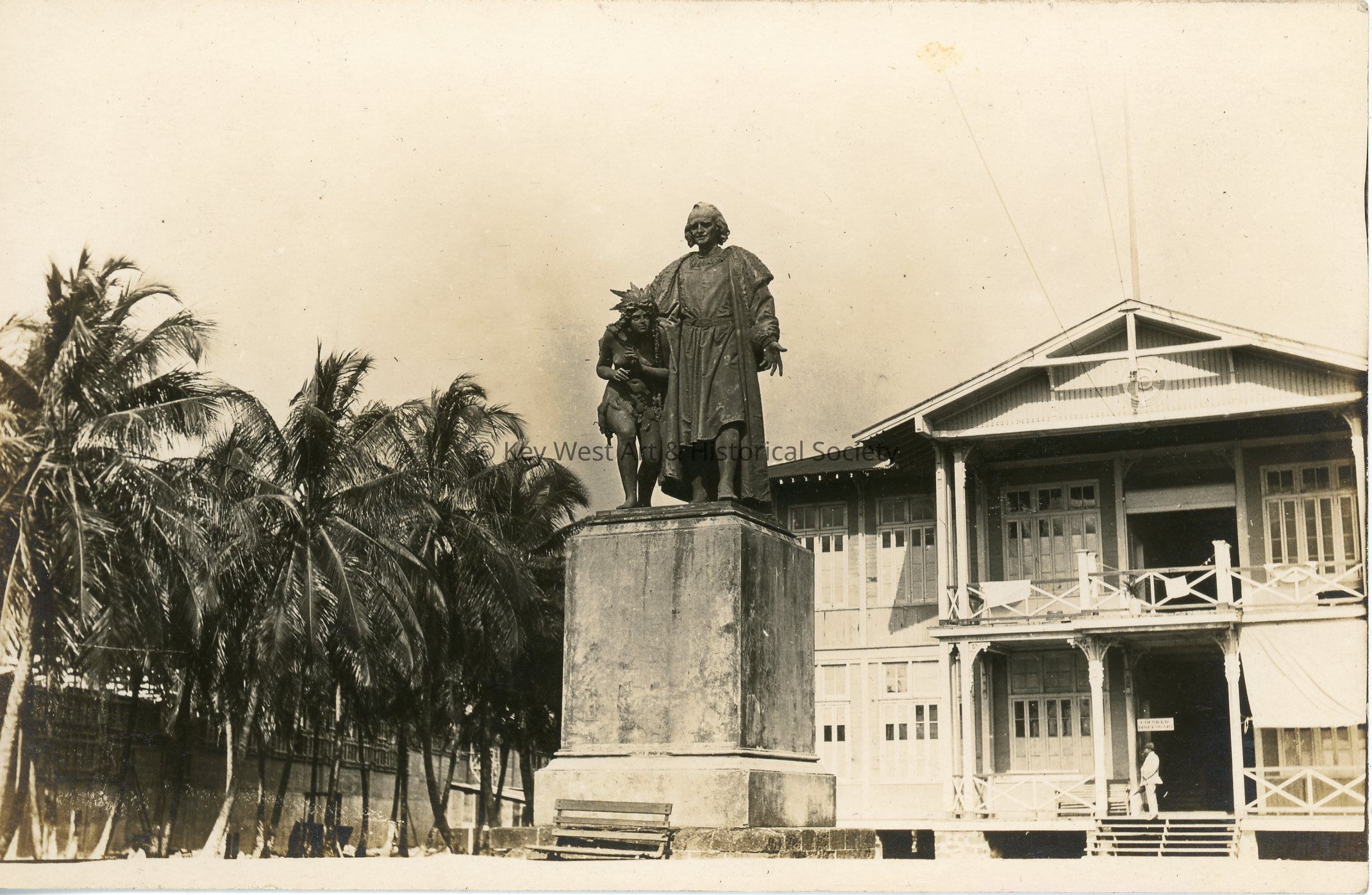 Black and white photograph postcard depicting a statue of Christopher Columbus holding an indigenous woman in the town of Cristobal, Panama. The statue is in front of the past home of Count de Lesseps. The postcard is addressed to Mrs. Geo. A. Balling.Subject
