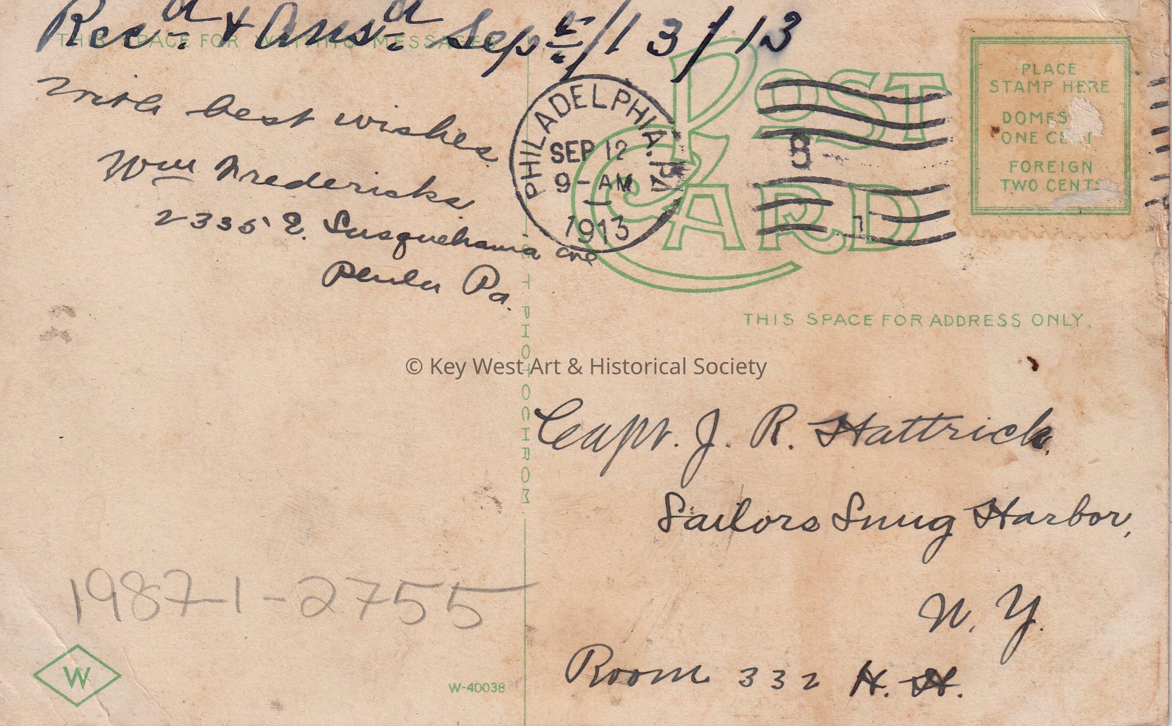 Postcard depicting a steamship on the water. The caption reads, ‘Steamer Long Beach, Wilmington-Penns Grove Ferry’. The message on the verso reads, ‘Many best wishes, W. Fredericks, 2335 E. Susquehanna Avenue, Philadelphia, Pennsylvania.’ The note on the verso reads, ‘Received and answered September 13, 1913'. The card is addressed to Captain J. R. Hattrick, Room 332, House H. Sailors Snug Harbor, New York, and is postmarked Philadelphia, September 12, 1913.Collection