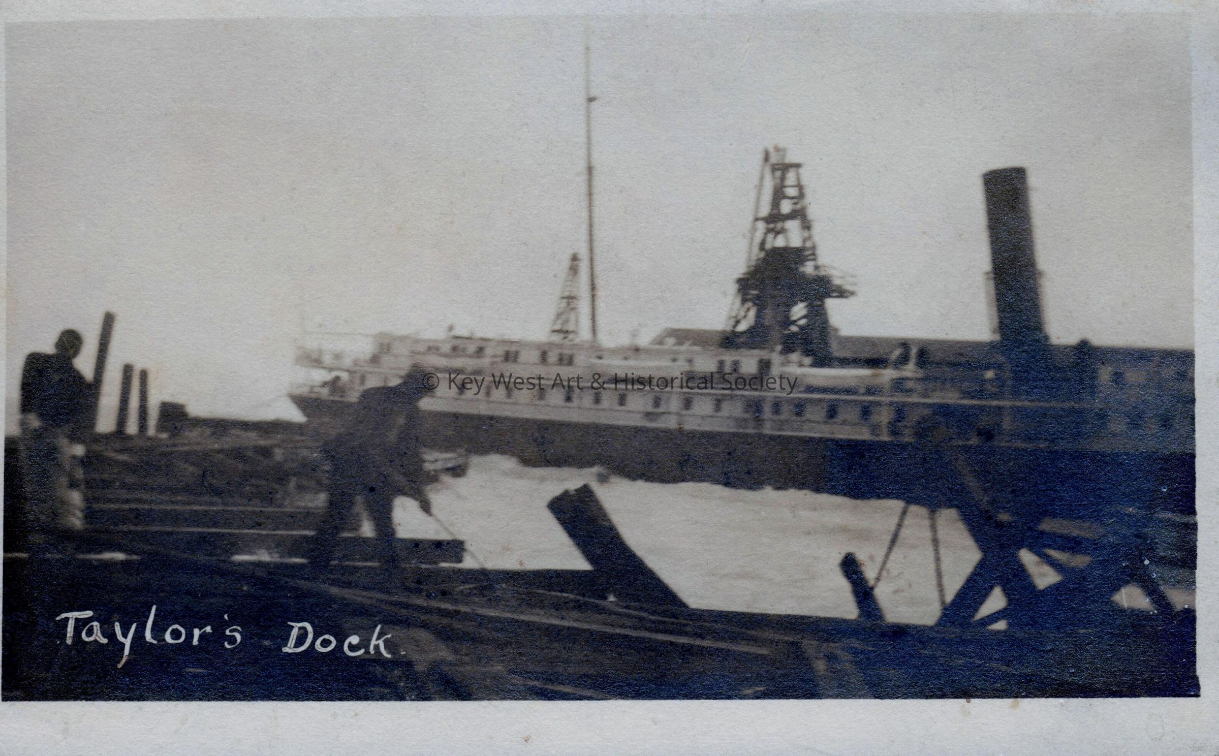 Postcard depicting men, boats, and a steamship. The caption reads, ‘Taylor’s Dock’.Subject Place