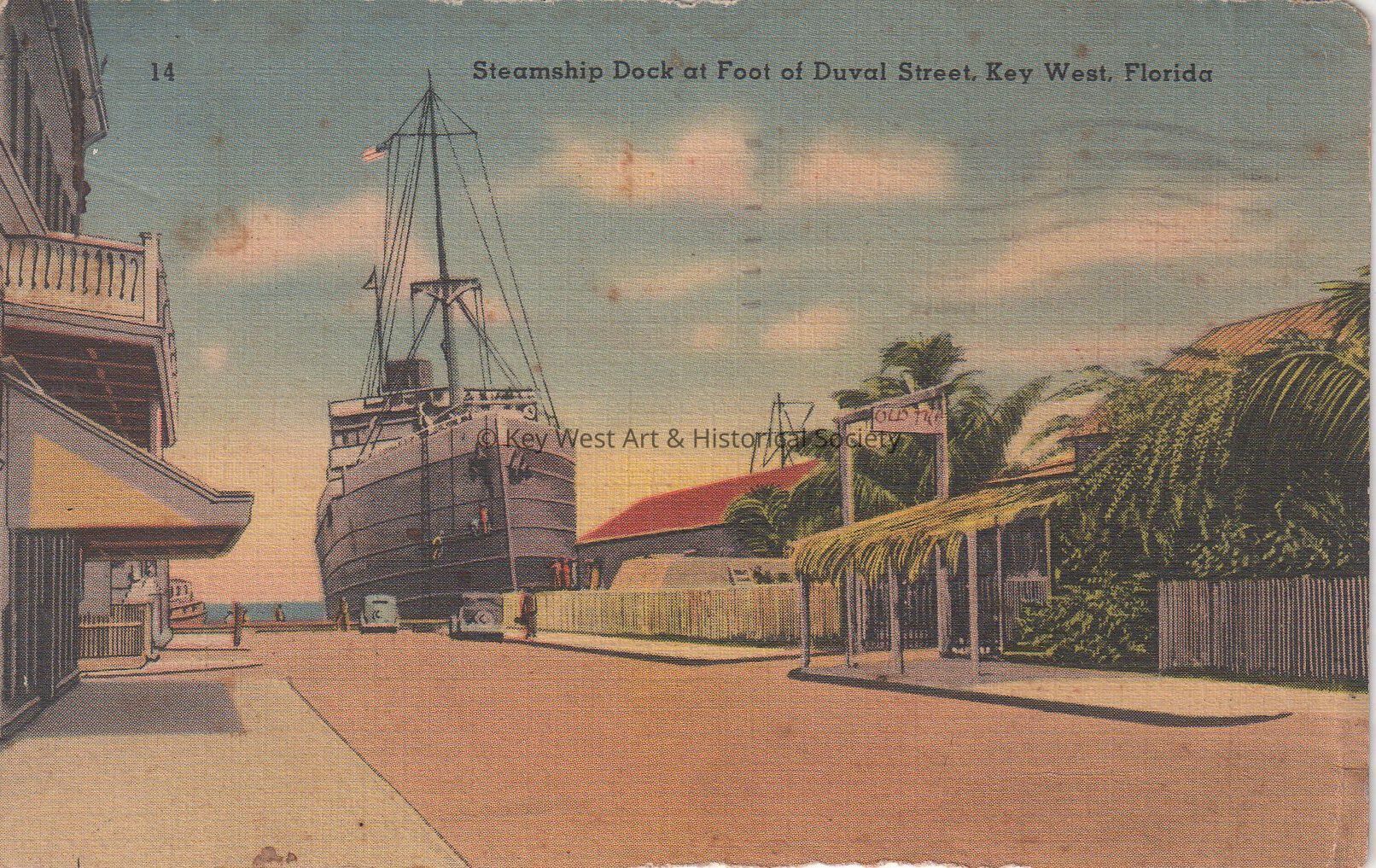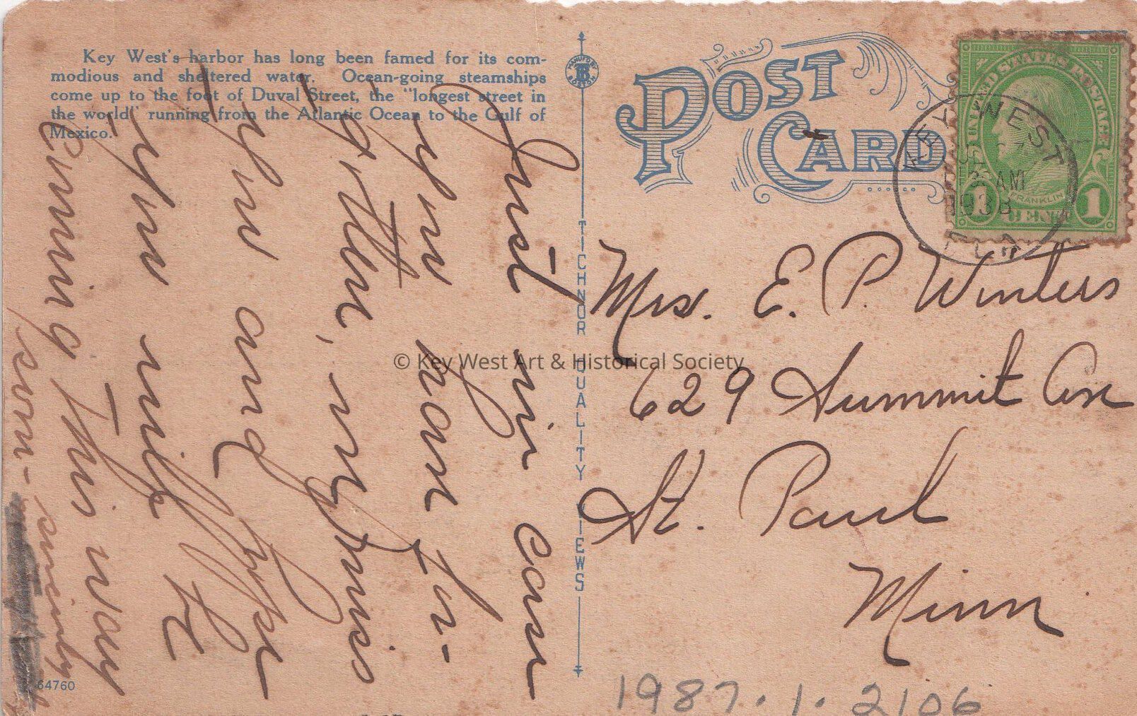 Postcard depicting a steamship docked at the end of a street. The caption reads, ‘Steamship Dock at Foot of Duval Street, Key West, Florida.’ The description on the verso reads, ‘Key West’s harbor has long been famed for its commodious and sheltered water. Ocean-going steamships come up to the foot of Duval Street, the “longest” street in the world running from the Atlantic Ocean to the Gulf of Mexico.' The message on the verso reads, ‘Just in case you have forgotten, we miss you and hope you will be coming this way soon. Sincerely’. The card is addressed to Mrs. E. P. Winters, 629 Summit Avenue, St. Paul, Minnesota, and is postmarked Key West, 1938.Collection