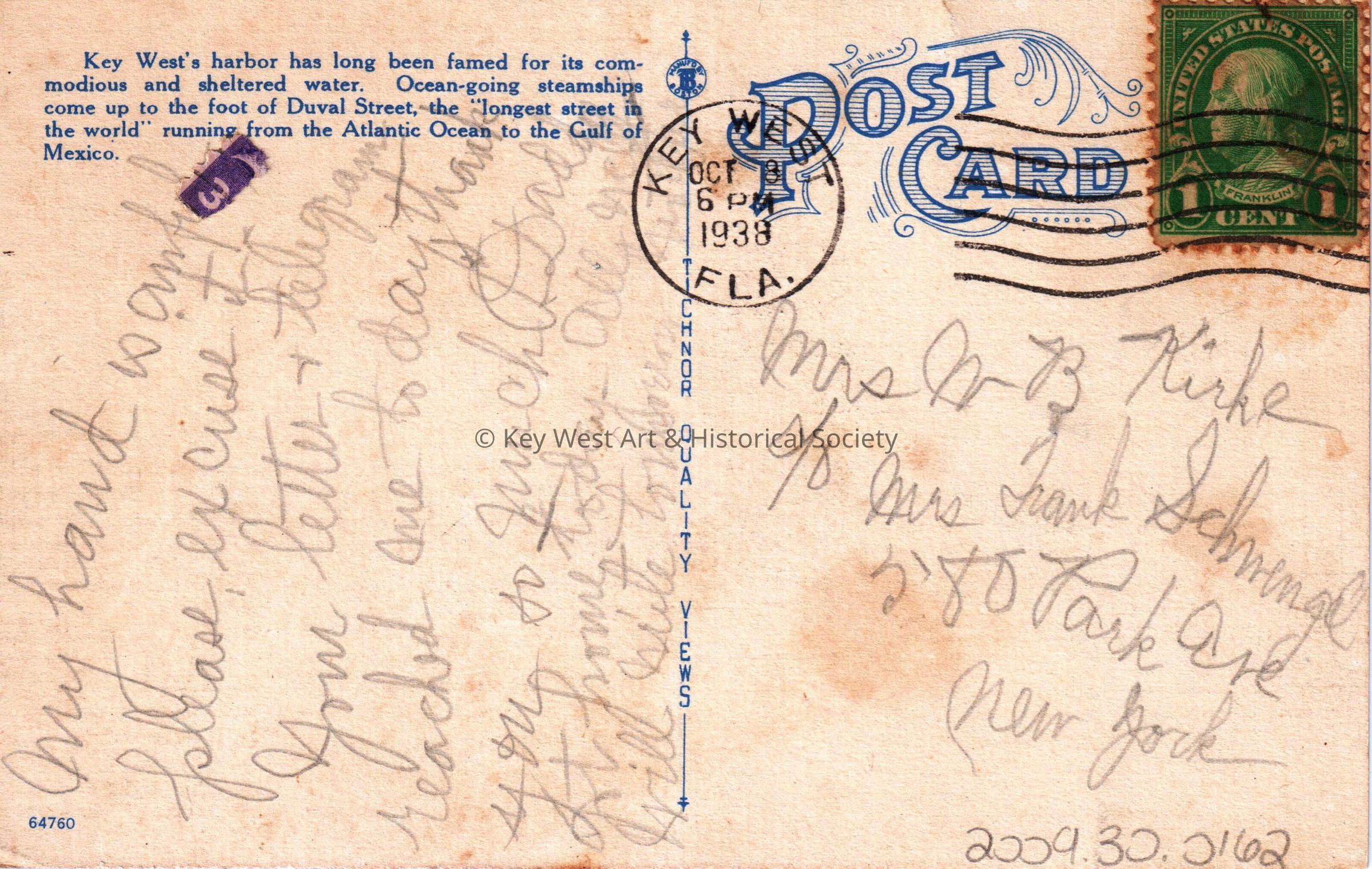 Postcard depicting a steamship. cars, buildings, and foliage. The caption reads, ‘Steamship Dock at Foot of Duval Street, Key West, Florida.’ The description on the verso reads, ‘Key West’s harbor has long been famed for its commodious and sheltered water. Ocean-going steamships come up to the foot of Duval Street, the “longest street in the world” running from the Atlantic Ocean to the Gulf of Mexico.’ The message on the verso reads, ‘My hand is awful, please excuse it. Your letter and telegram reached me today. Thank you so much. Daddy got home today. All well, will write tomorrow.’ The card is addressed to Mrs. W.B. Kirke, care of Mrs. Frank Schmengle, 580 Park Avenue, New York, and is postmarked Key West, October 8, 1938.Collection