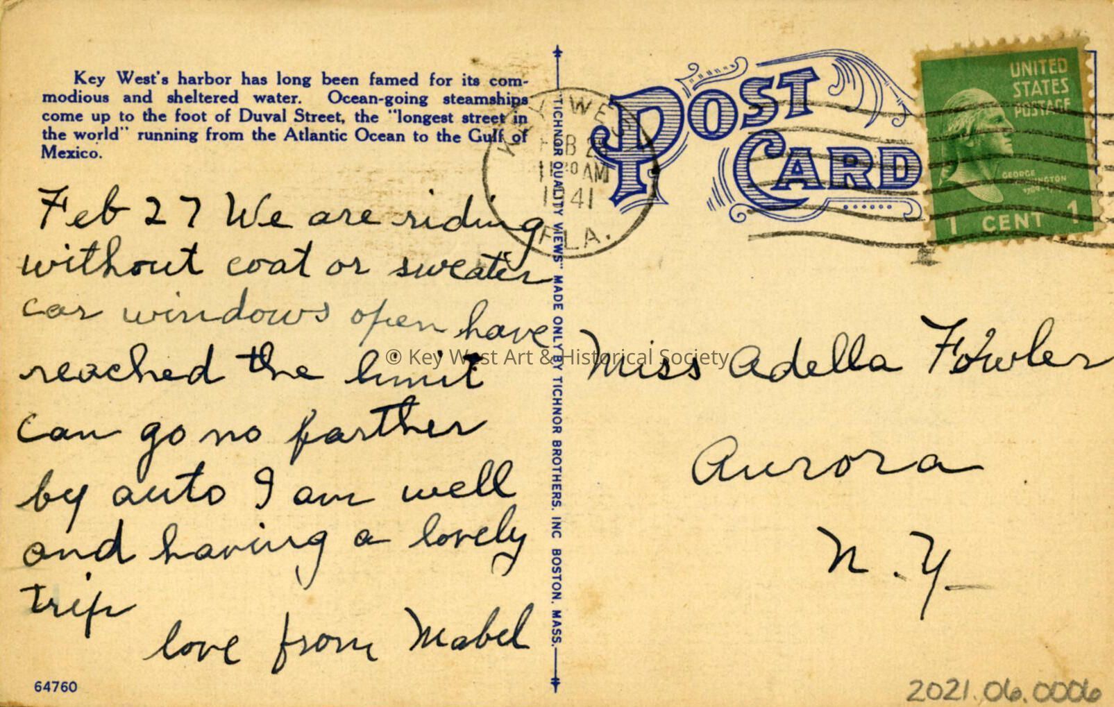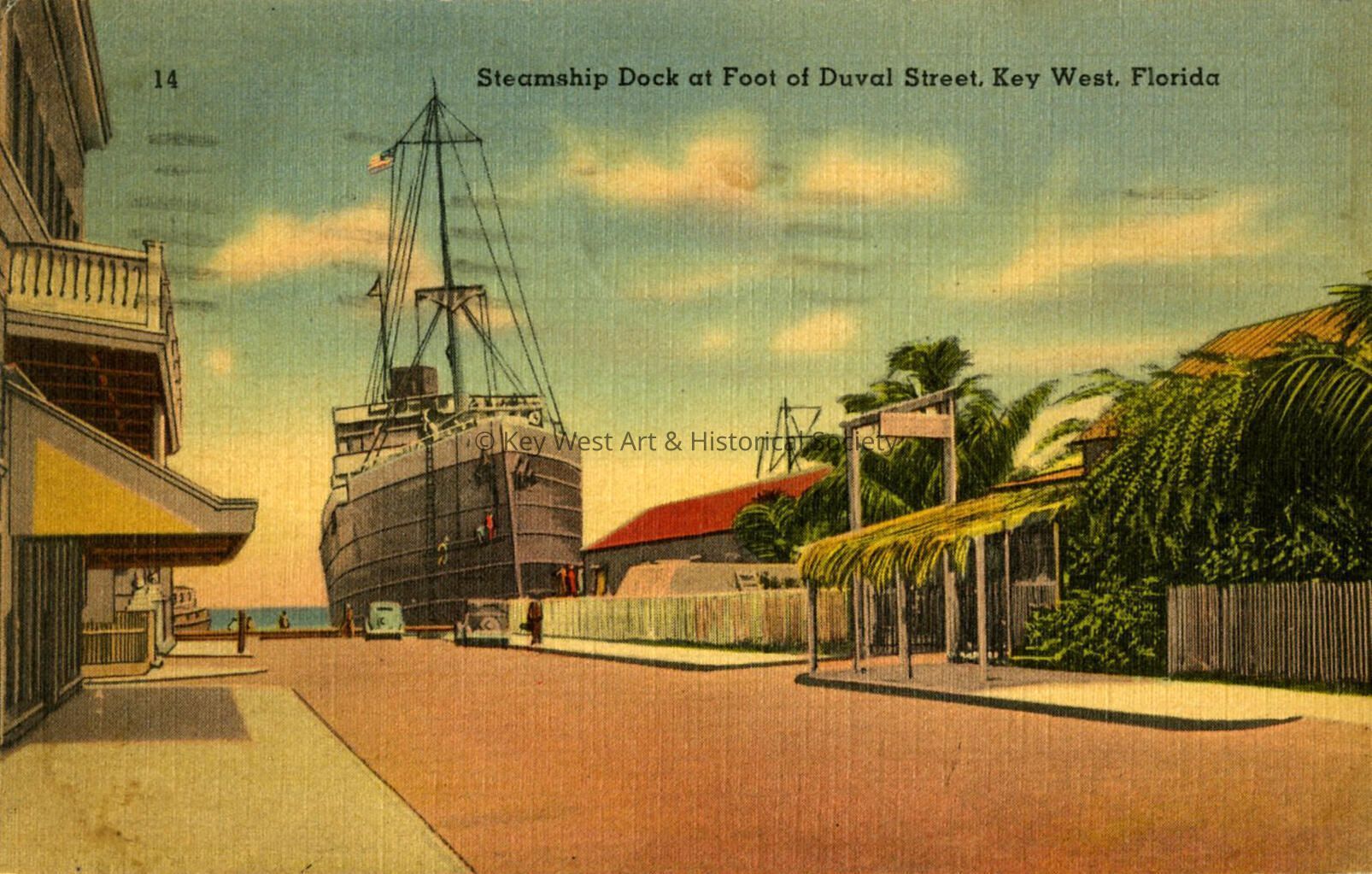 Postcard depicting a steamship at the foot of Duval Street. The caption reads, ‘Steamship Dock at Foot of Duval Street, Key West, Florida.’ The caption on the verso reads, ‘Key West’s harbor has long been famed for its commodious and sheltered water. Ocean-going steamships come up to the foot of Duval Street, the “longest street in the world” running from the Atlantic Ocean to the Gulf of Mexico.’Subject Place