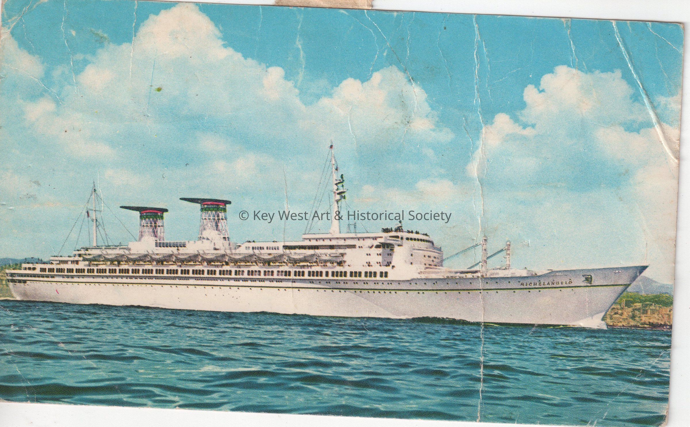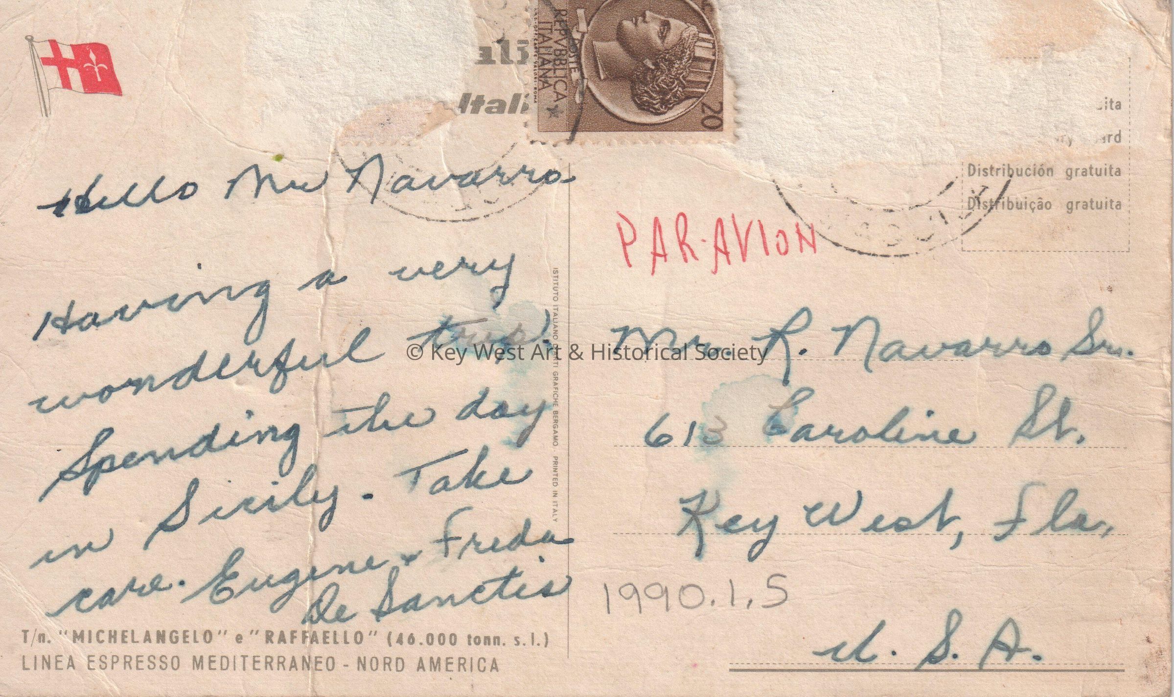 Postcard depicting a steamship on the water. The description on the verso reads, ‘Steamship “Michelangelo” e “Raffaello” (40,000 Tons) Linea Expresso Mediterraneo – Nord America.’ The message on the verso reads, ‘Hello, Mr. Navarro, Having a very wonderful trip. Spending the day in Sicily. Take care. Eugene & Freda DeSanctis.’ The card is addressed to Mr. R. Navarro, Sr., 613 Caroline Street, Key West, Florida, U.S.A.Collection