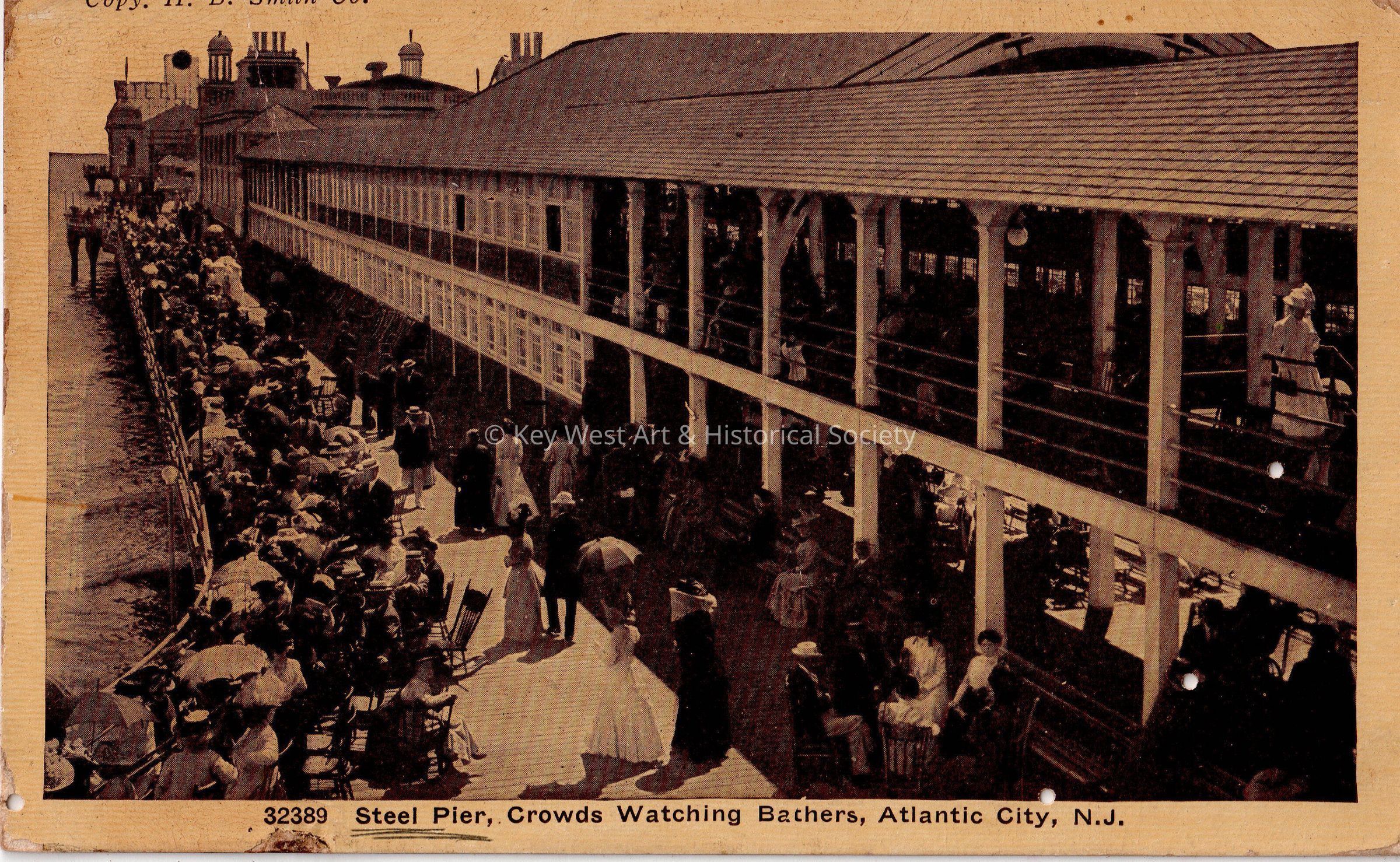 Postcard depicting people on a pier. The caption reads, ‘Steel Pier, Crowds Watching Bathers, Atlantic City, New Jersey’.Subject Place