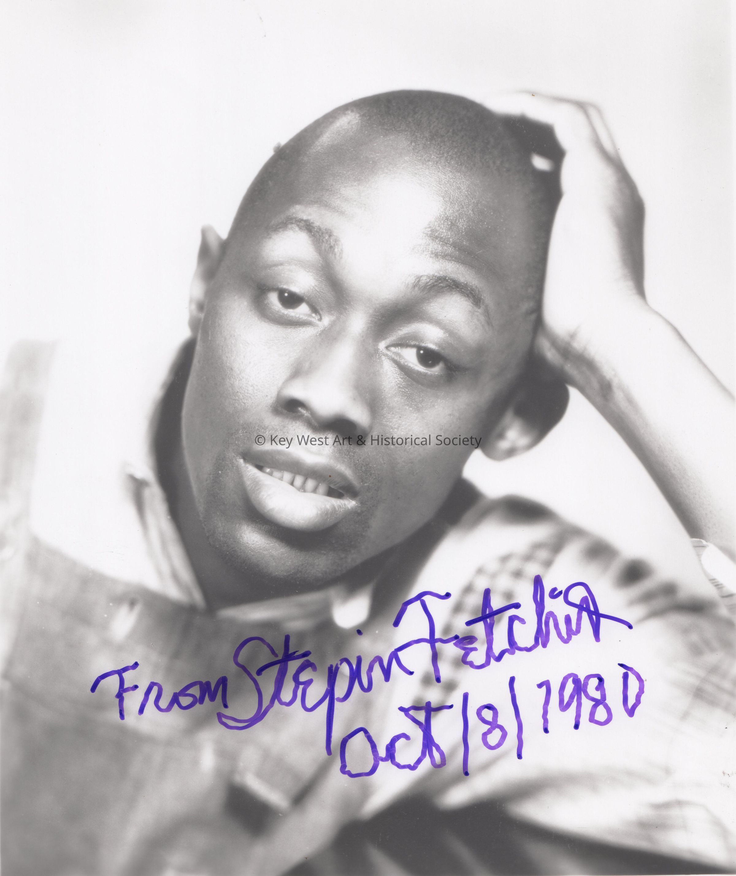 Black and white headshot of Black Key West actor Stepin Fetchit (real name Lincoln Theodore Monroe Andrew Perry) with signature dated October 8, 1980.