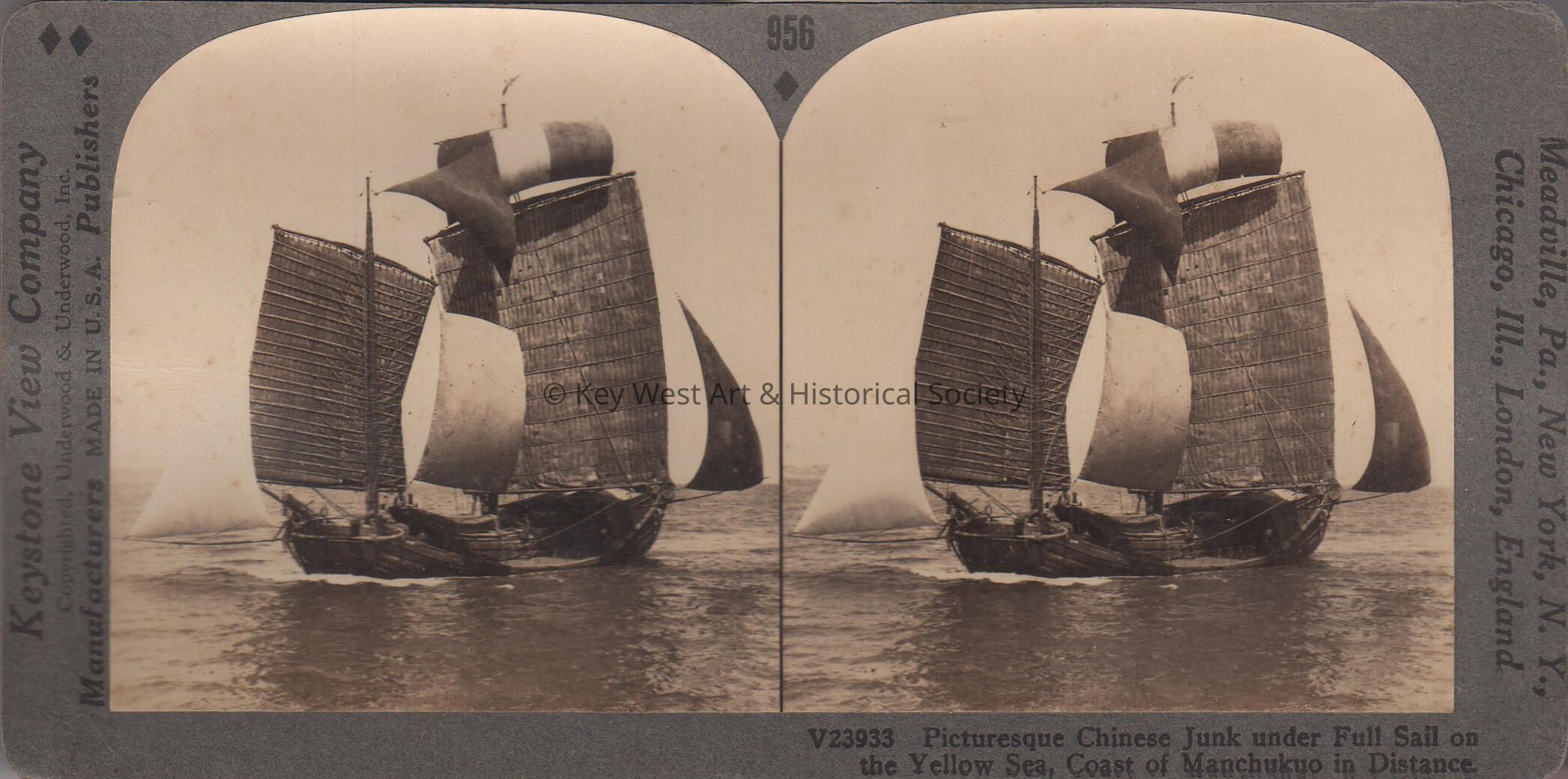 Stereoview of a Chinese Junk under full sail on the Yellow Sea