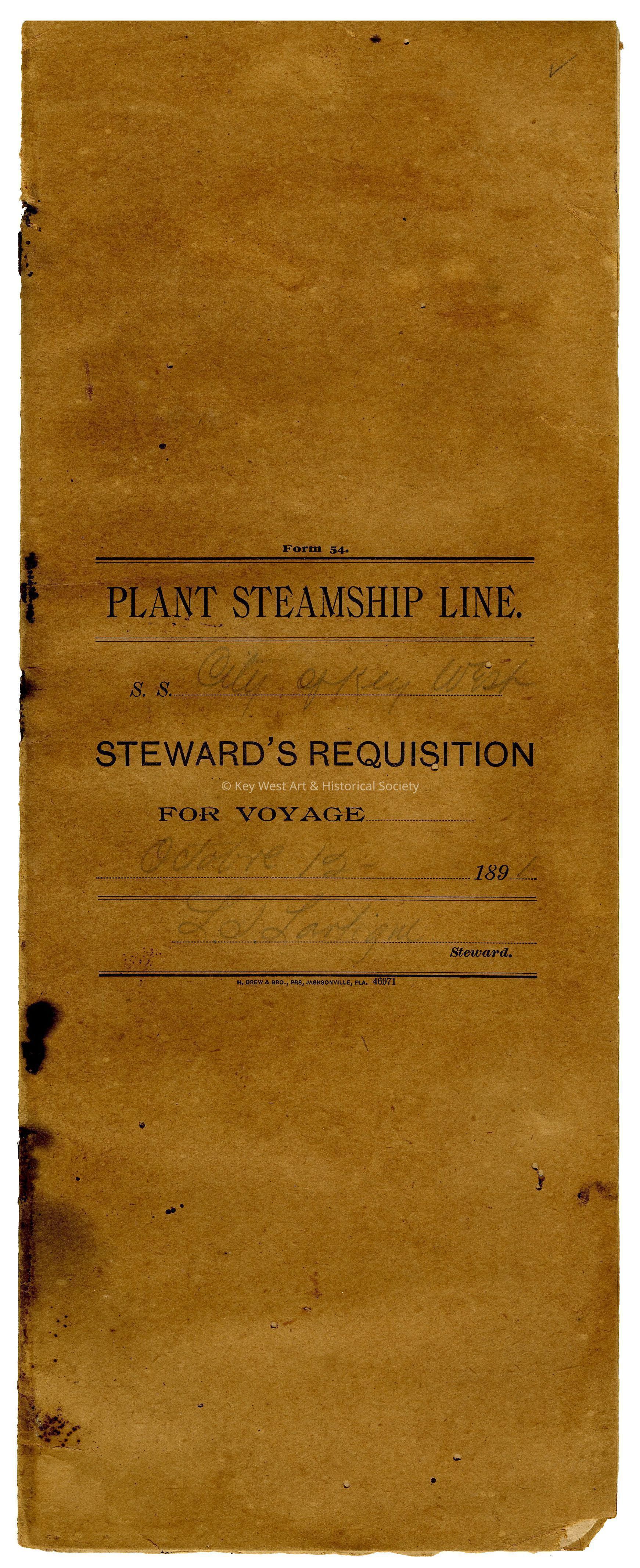 Plant Steamship Line steward's requisition book for a voyage taken onboard SS CITY OF KEY WEST on October 12, 1891. Completed by Lt. Lartigue, the steward.