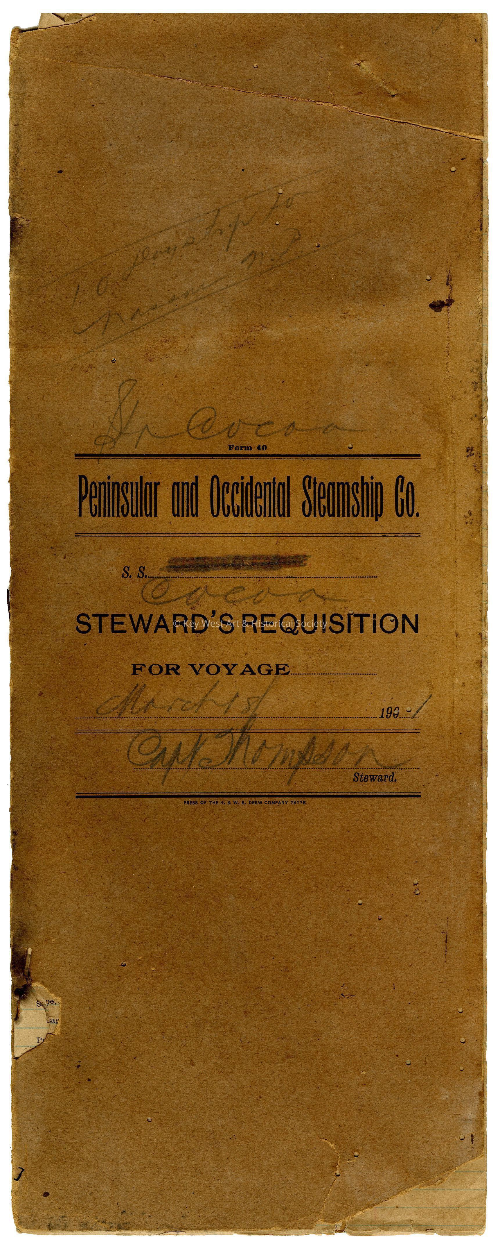 Peninsular & Occidental Steamship Company steward's requisition book for a ten day voyage to Nassau, Bahamas taken onboard SS COCOA on March 18, 1901. Reference to Captain Thompson on the cover.