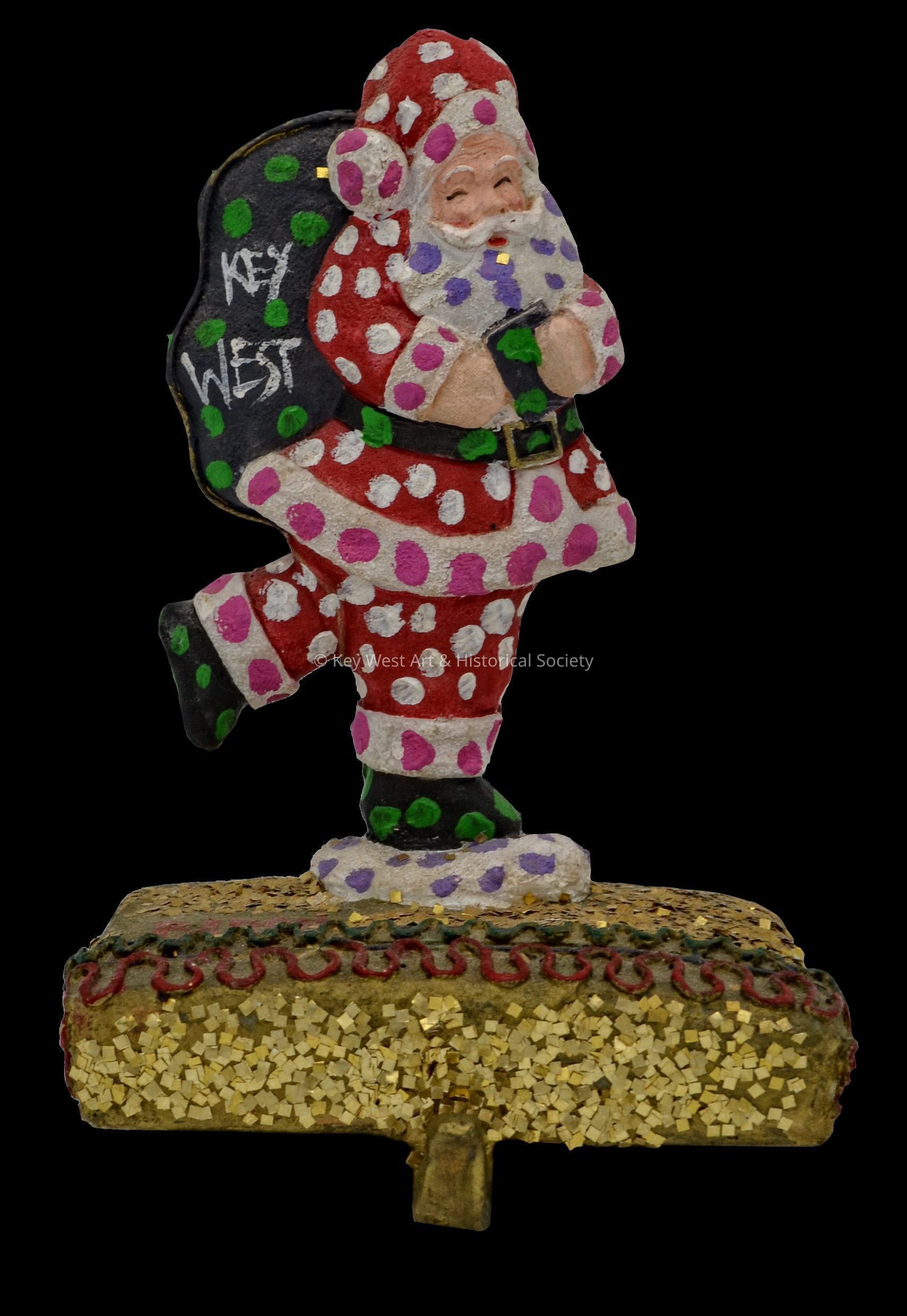 Painted and glittered Santa Clause stocking holder by Jack Baron. The stocking holder is intended for use on a mantle.