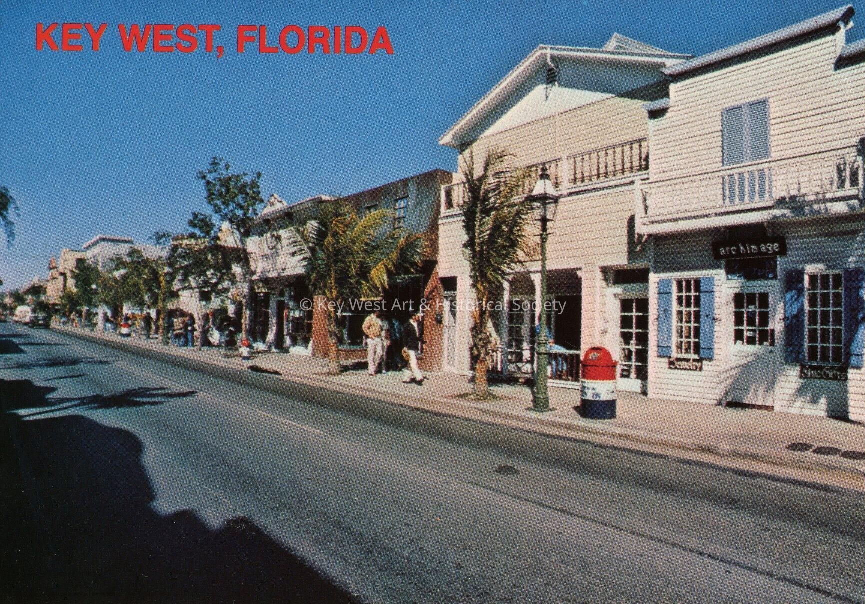 Postcard depicting stores along Duval Street. Description on verso reads, 'Duval St. in the center of 'Old Key West' is a charming array of gingerbread buildings that house countless shops. Key West, Fla.'Collection