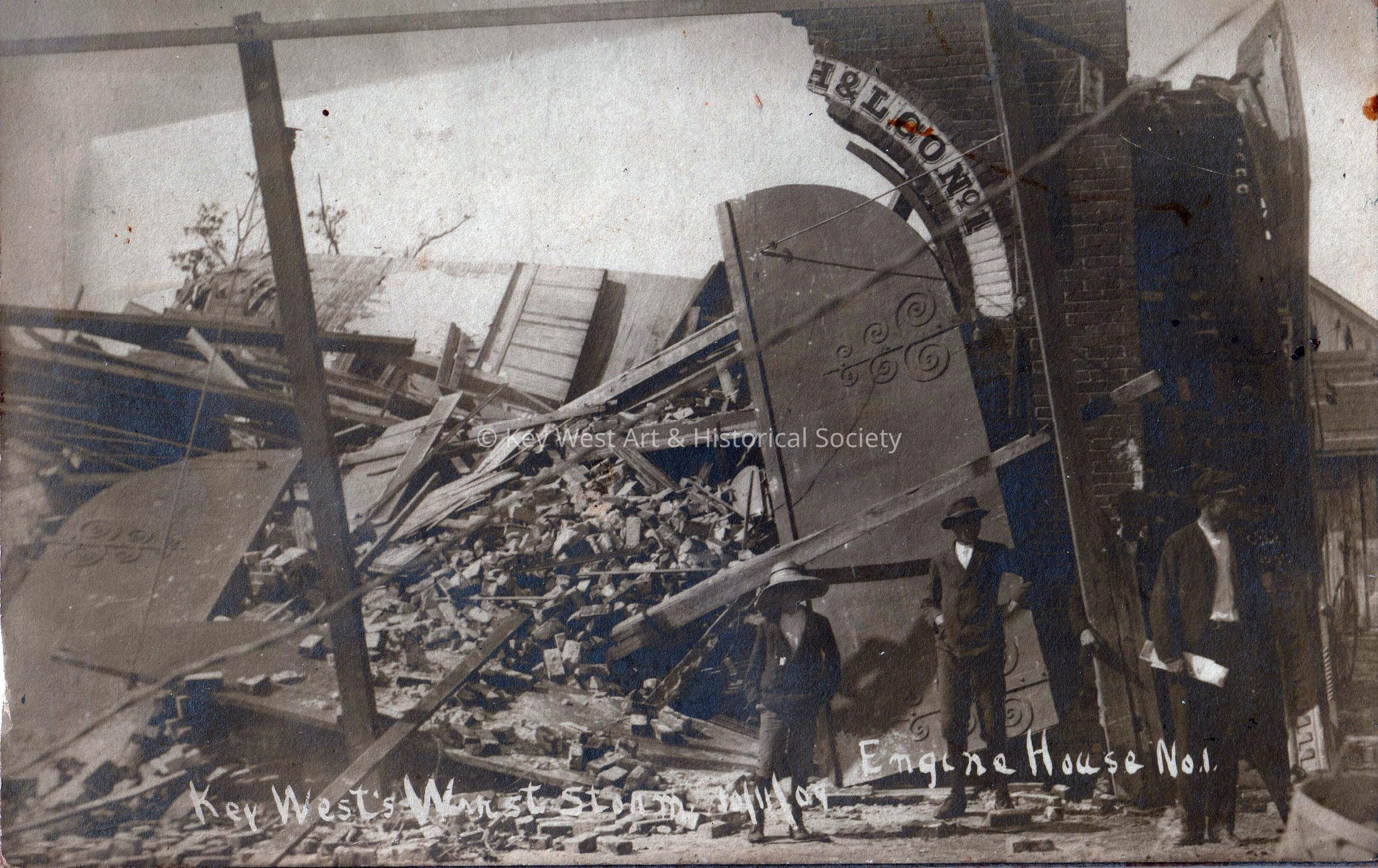 Rubble and the doors of Engine House No. 1 in Key West following the hurricane of October 11, 1909.