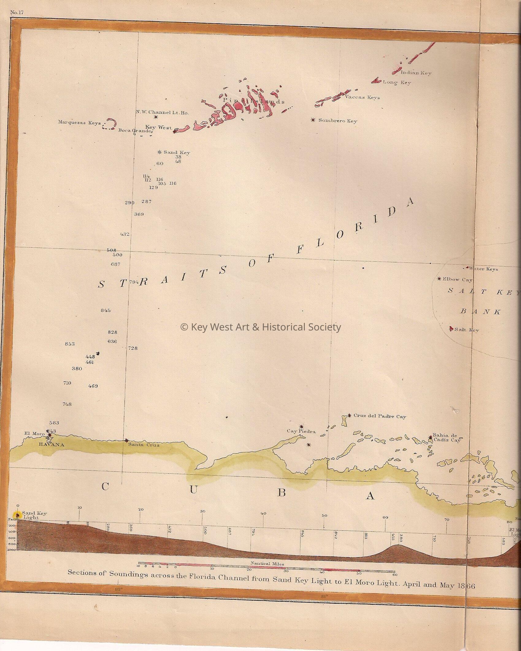 Paper map removed from a book of the lower keys from Indian Key to Key West, the Straits of Florida, and the northern coast of Cuba.Collection