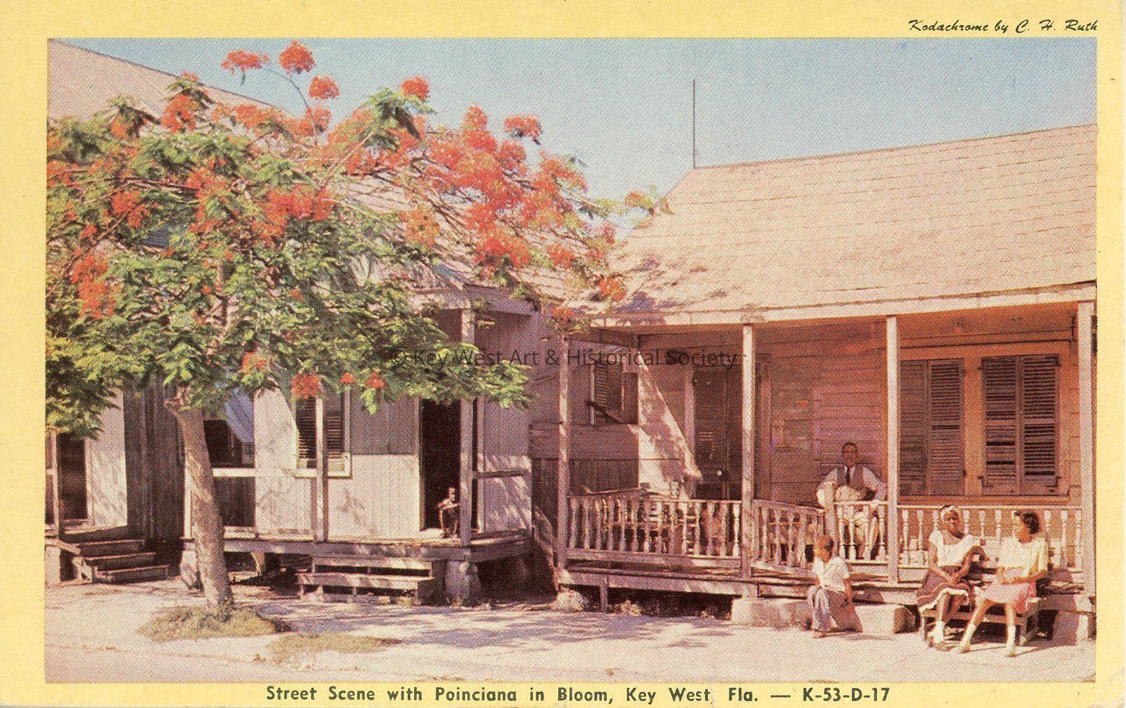 Postcard depicting a street scene with a Poinciana tree in bloom in Key West, Florida.Collection