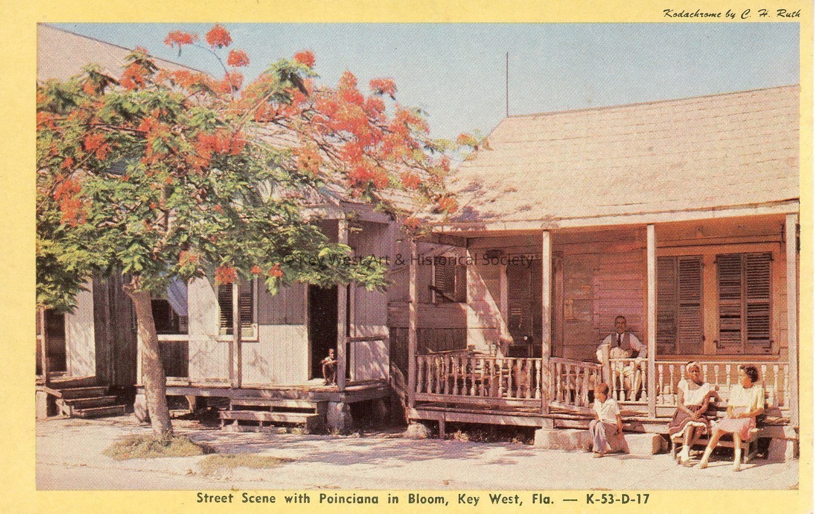 Postcard depicting a street scene with a Poinciana tree in bloom in Key West, Florida.Collection