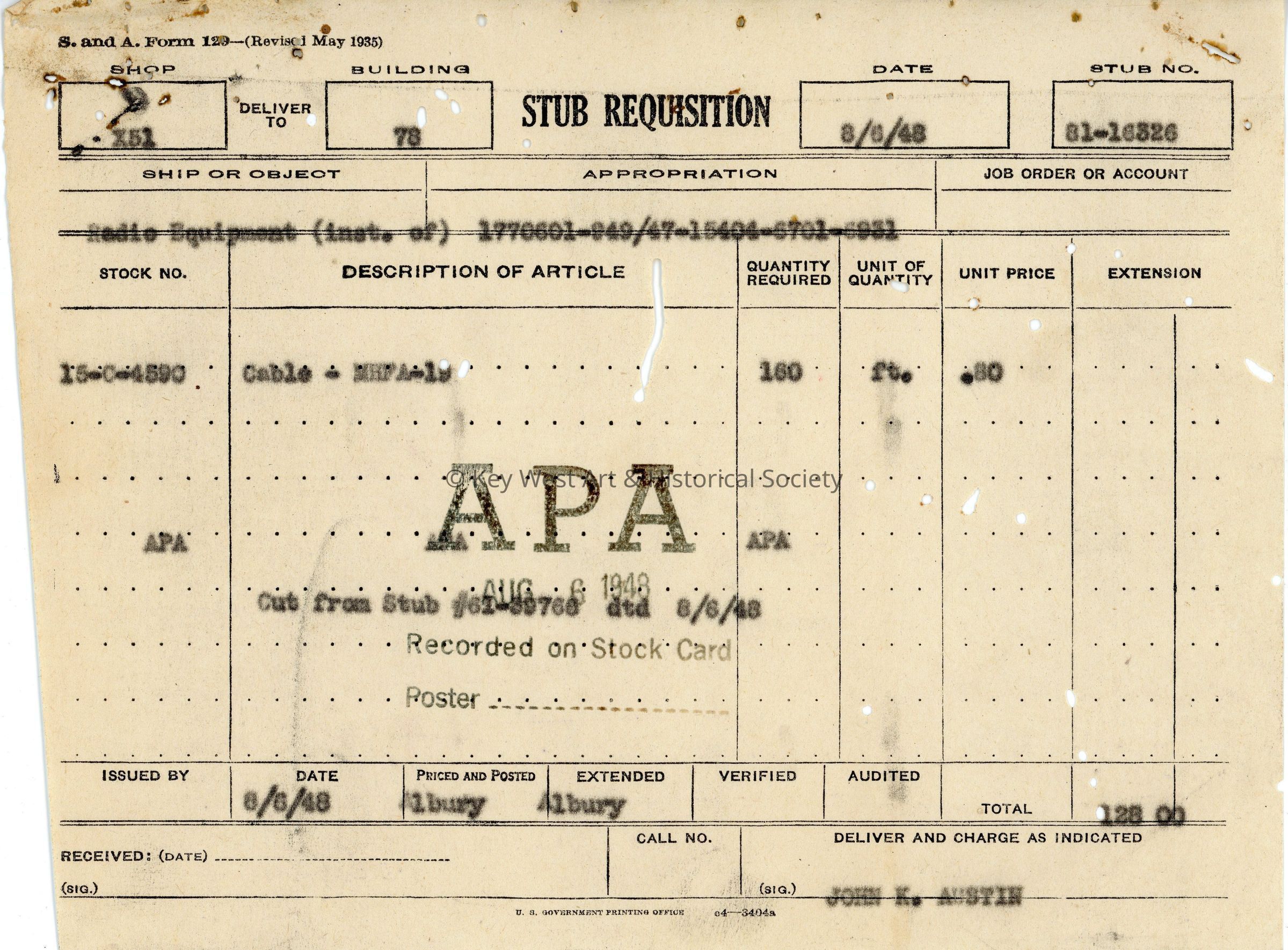 Stub Requisition Form: © Key West Art & Historical Society