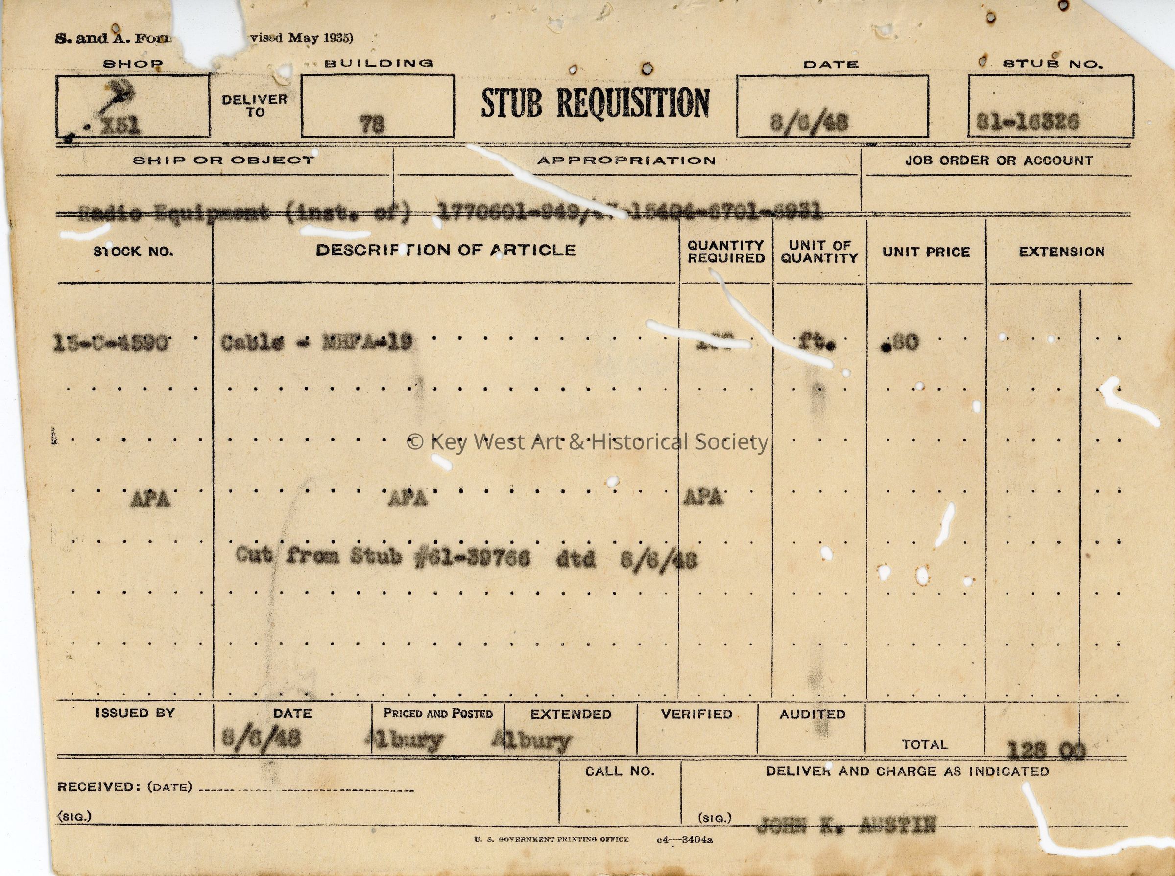 Stub Requisition Form: © Key West Art & Historical Society