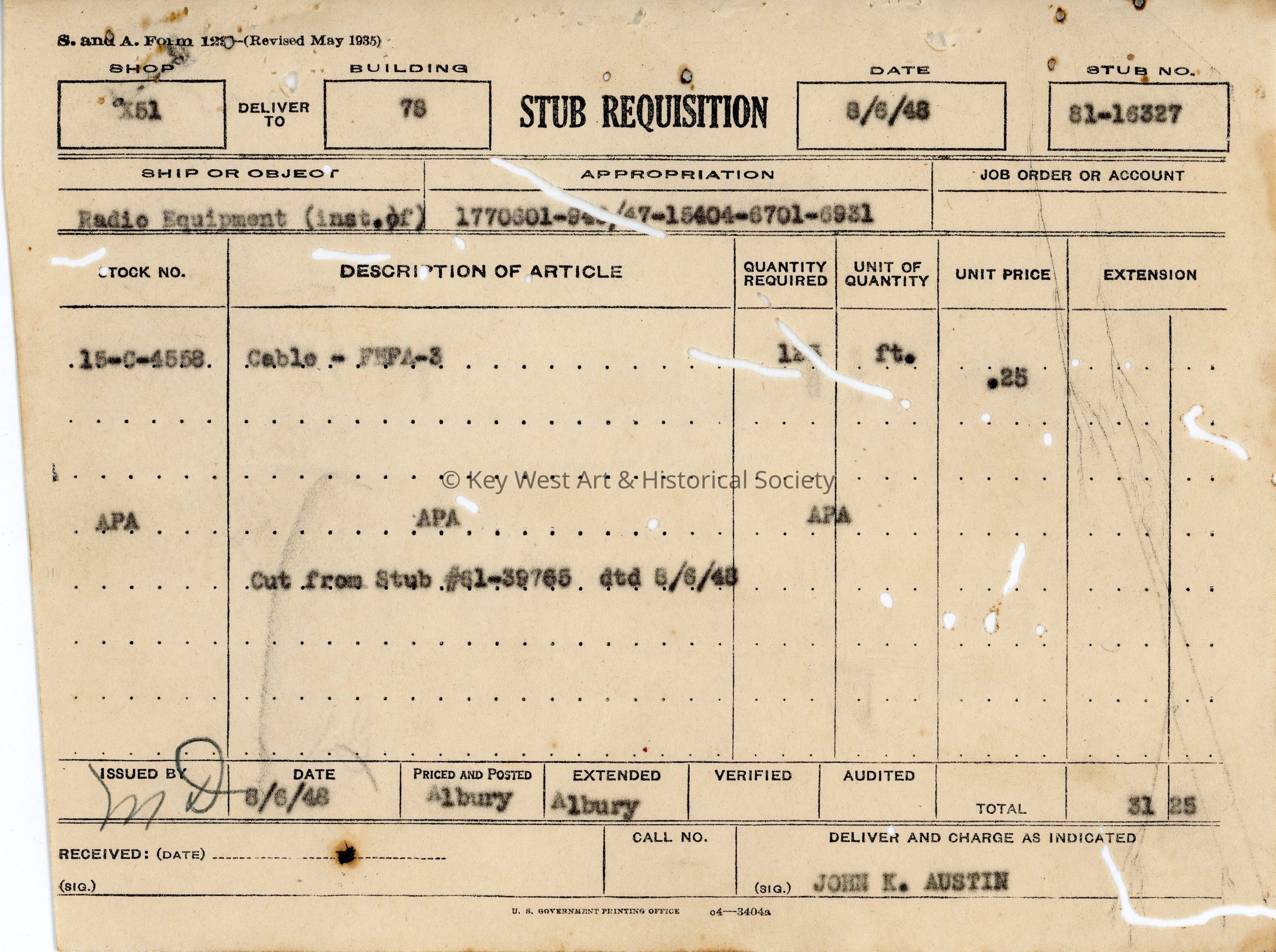 Stub Requisition Form: © Key West Art & Historical Society