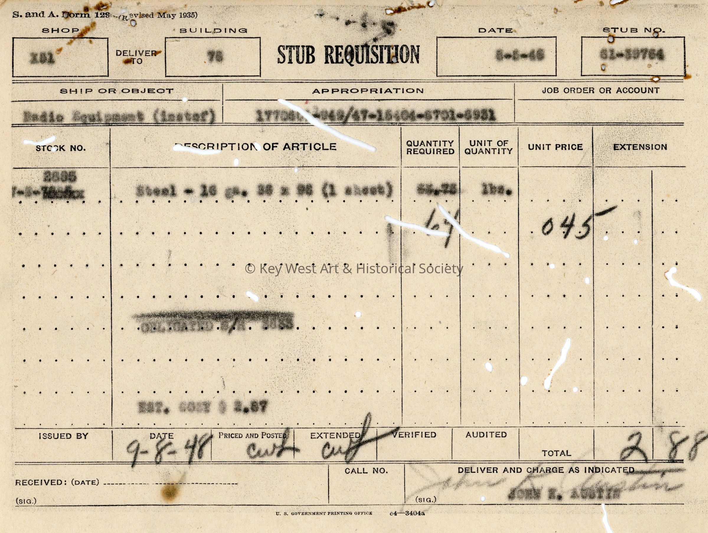 Stub Requisition Form: © Key West Art & Historical Society