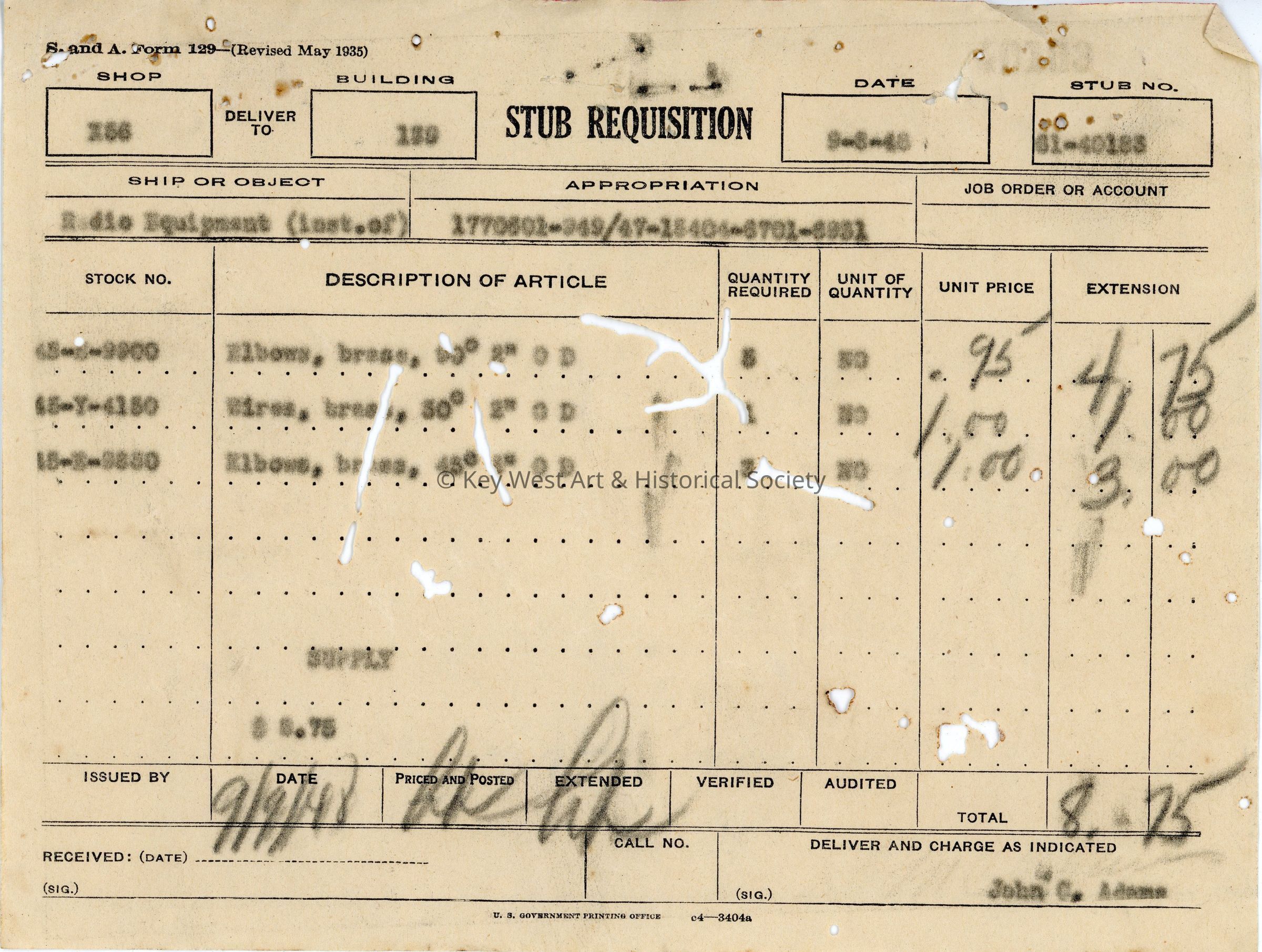 Stub Requisition Form: © Key West Art & Historical Society