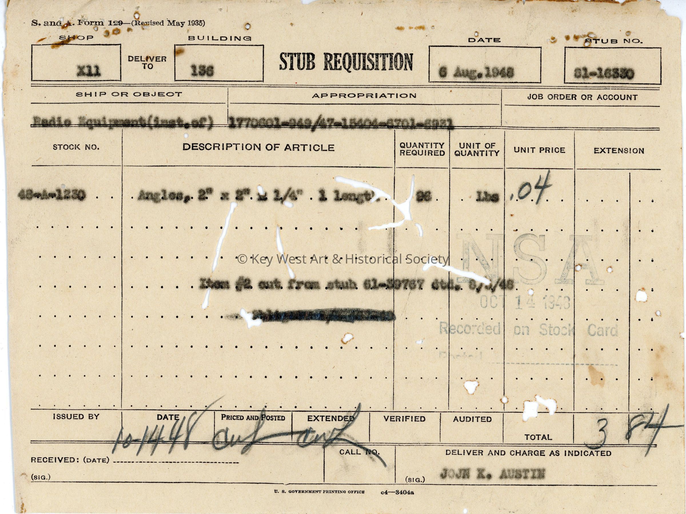 Requisition form for angles to be used in the installation of radio equipment on the USS EPCS-1431 stationed at Naval Station Key West.