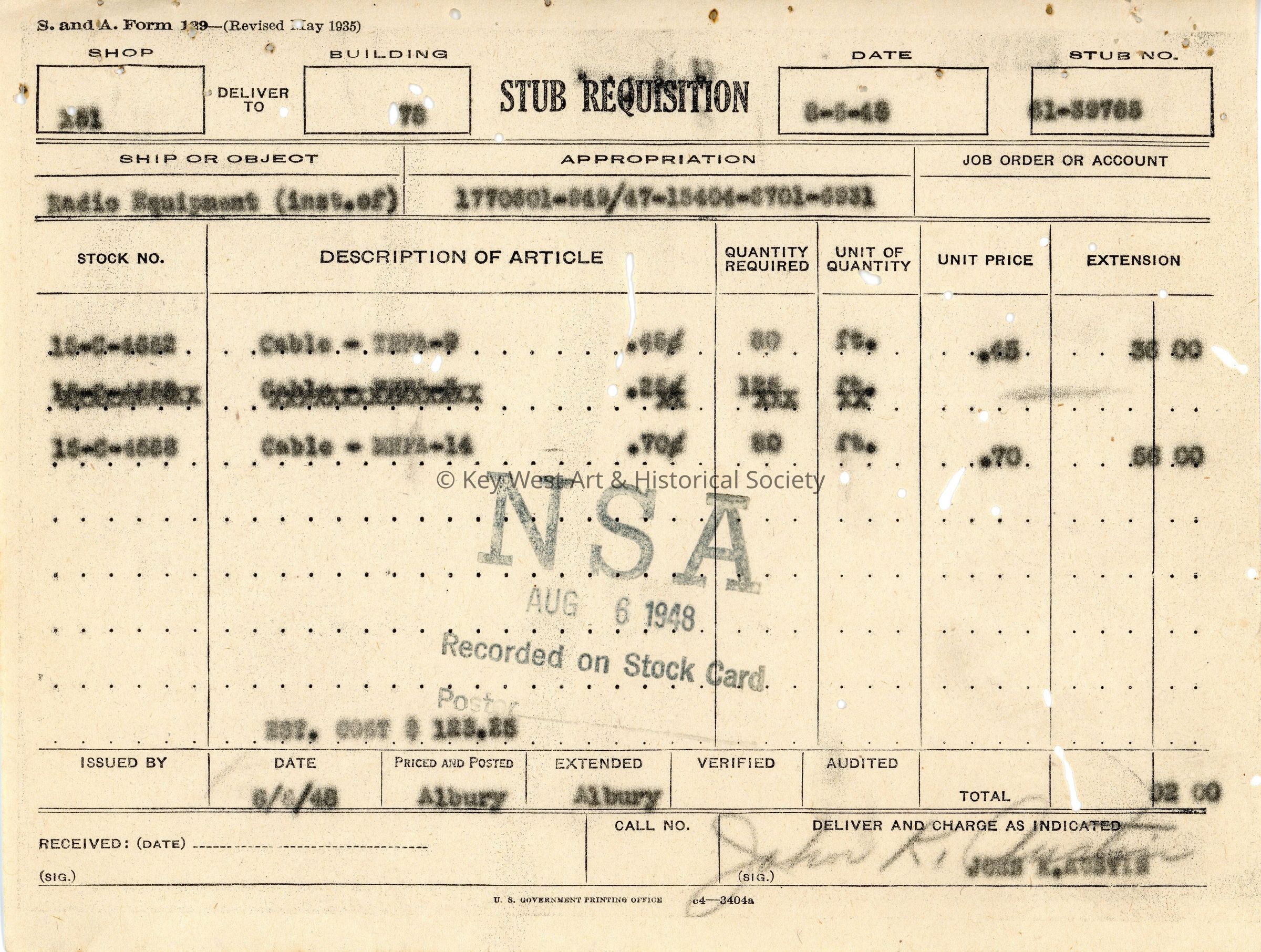 Requisition form for cable to be used in the installation of radio equipment on the USS EPCS-1431 stationed at Naval Station Key West.