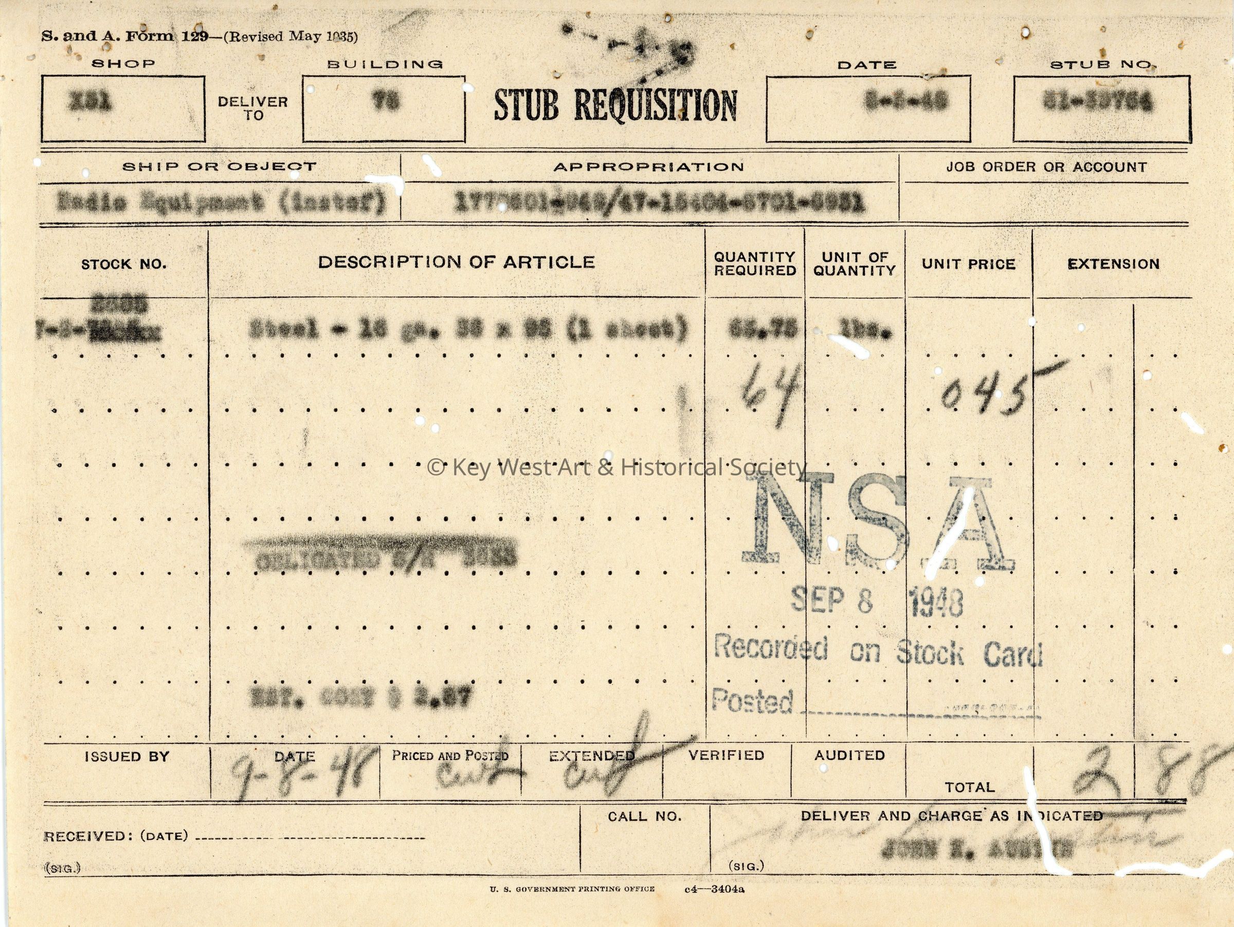 Stub Requisition Form: © Key West Art & Historical Society