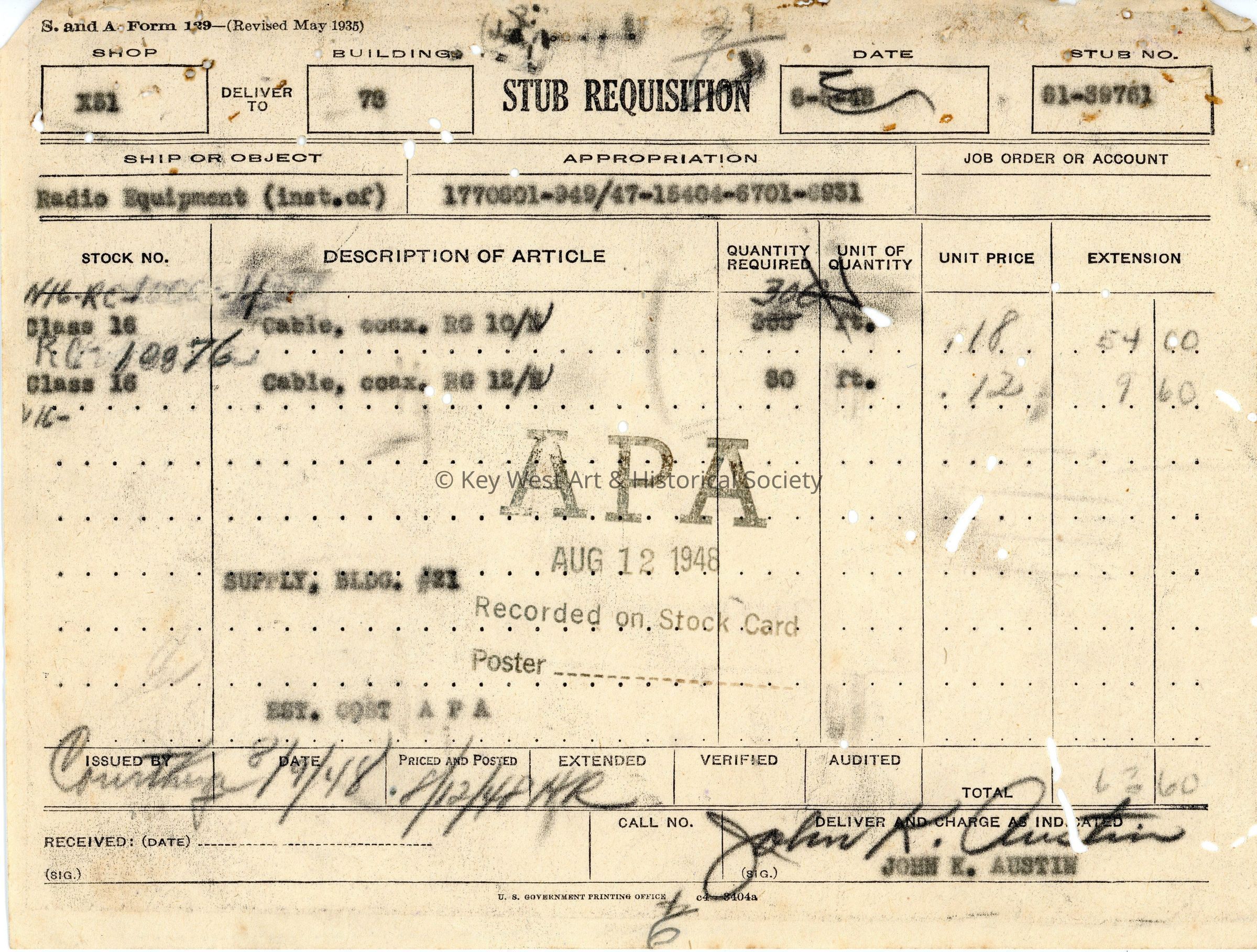 Stub Requisition Form: © Key West Art & Historical Society