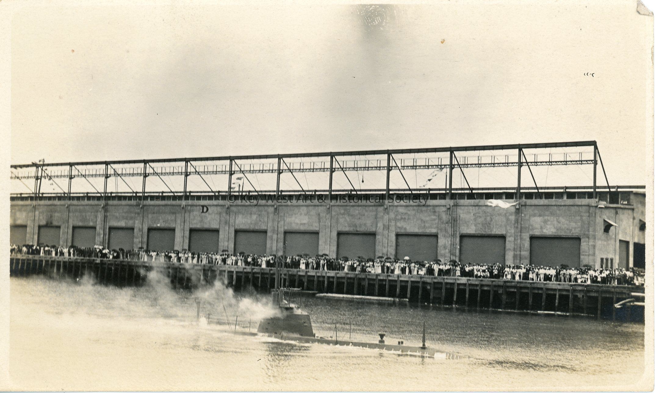 Black and white photograph depicting a submarine in the Panama Canal dated July 4, 1914. A crowd watches as steam or smoke rises from the sail. The photo was likely taken at the Gatun Locks. The photograph was designed to be attached to a postcard backing.Photograph Details