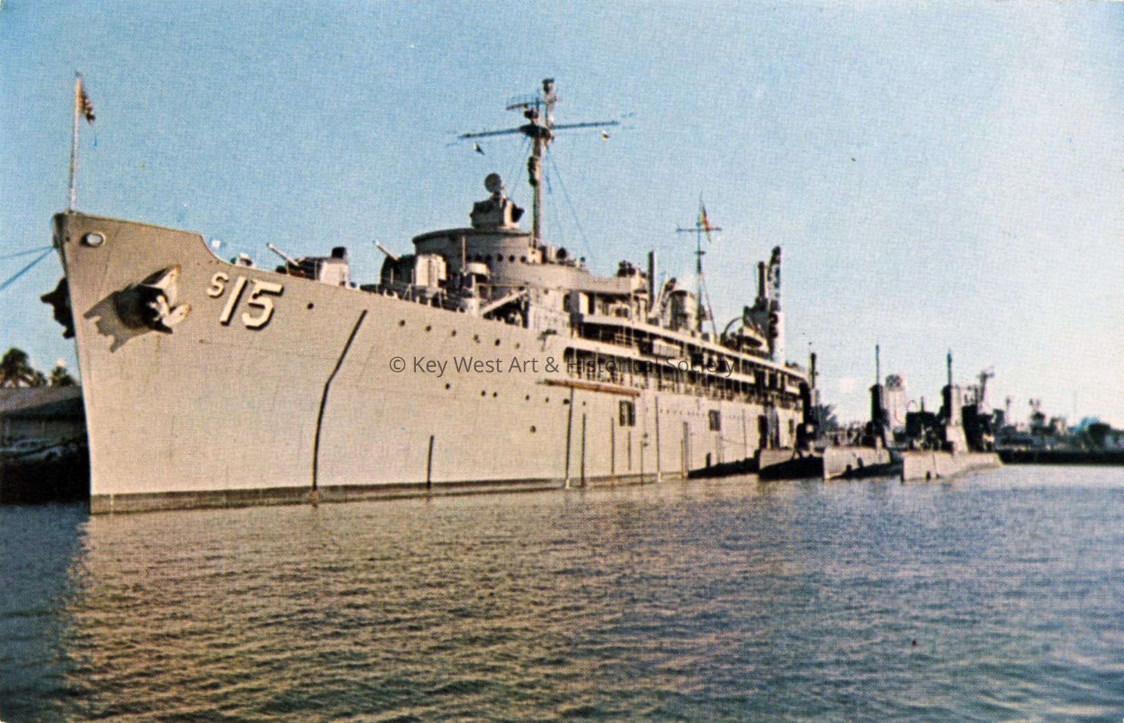 Postcard depicting the U.S.S. BUSHNELL. Notation on verso, 'U.S.S. Bushnell Submarine Tender based at Key West Naval Station. Alongside may be seen three submarines and in the background an anti-submarine destroyer.'Subject Person/Organization