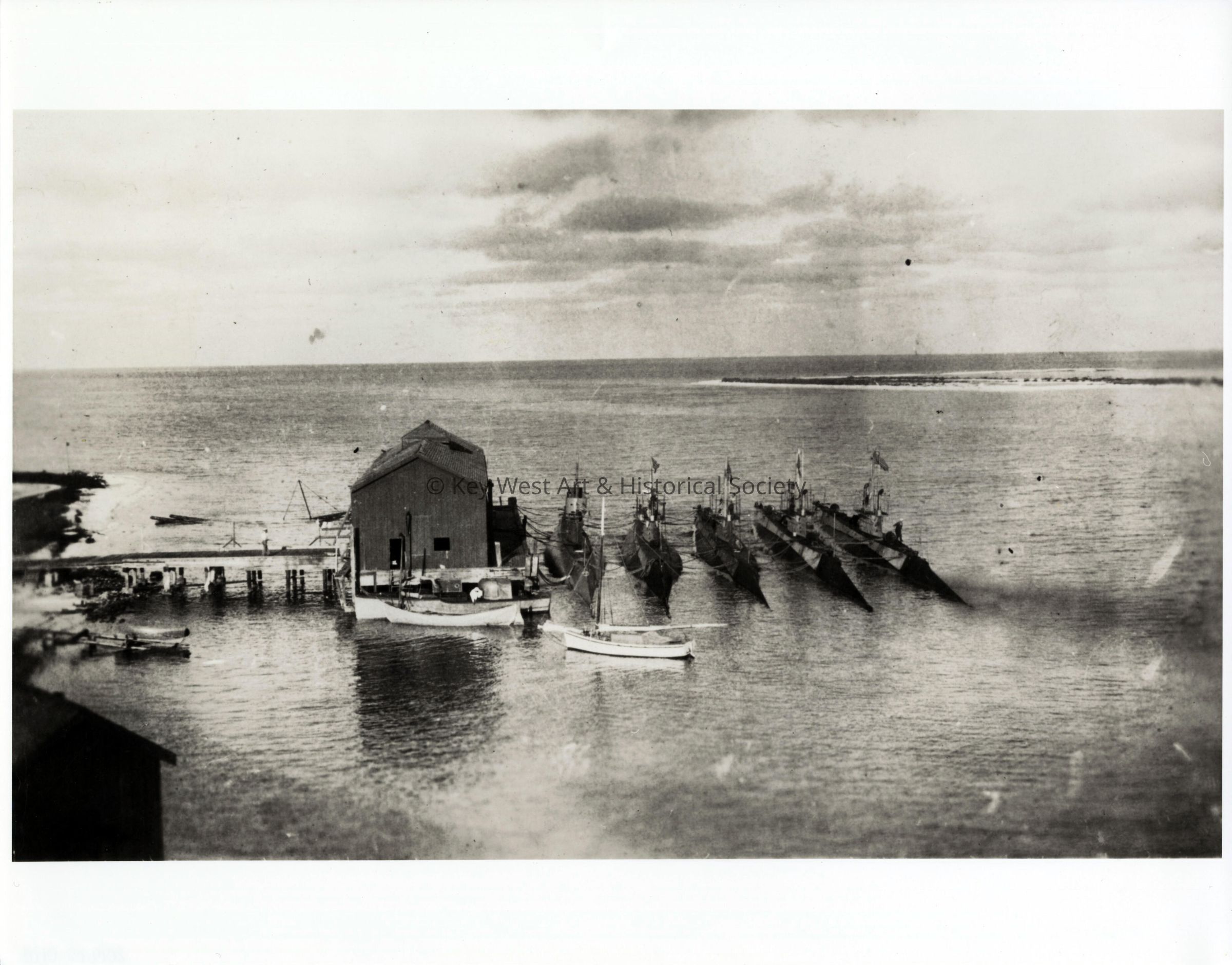 Black and white photograph of five submarines alongside the pier at Fort Jefferson in the Dry Tortugas.