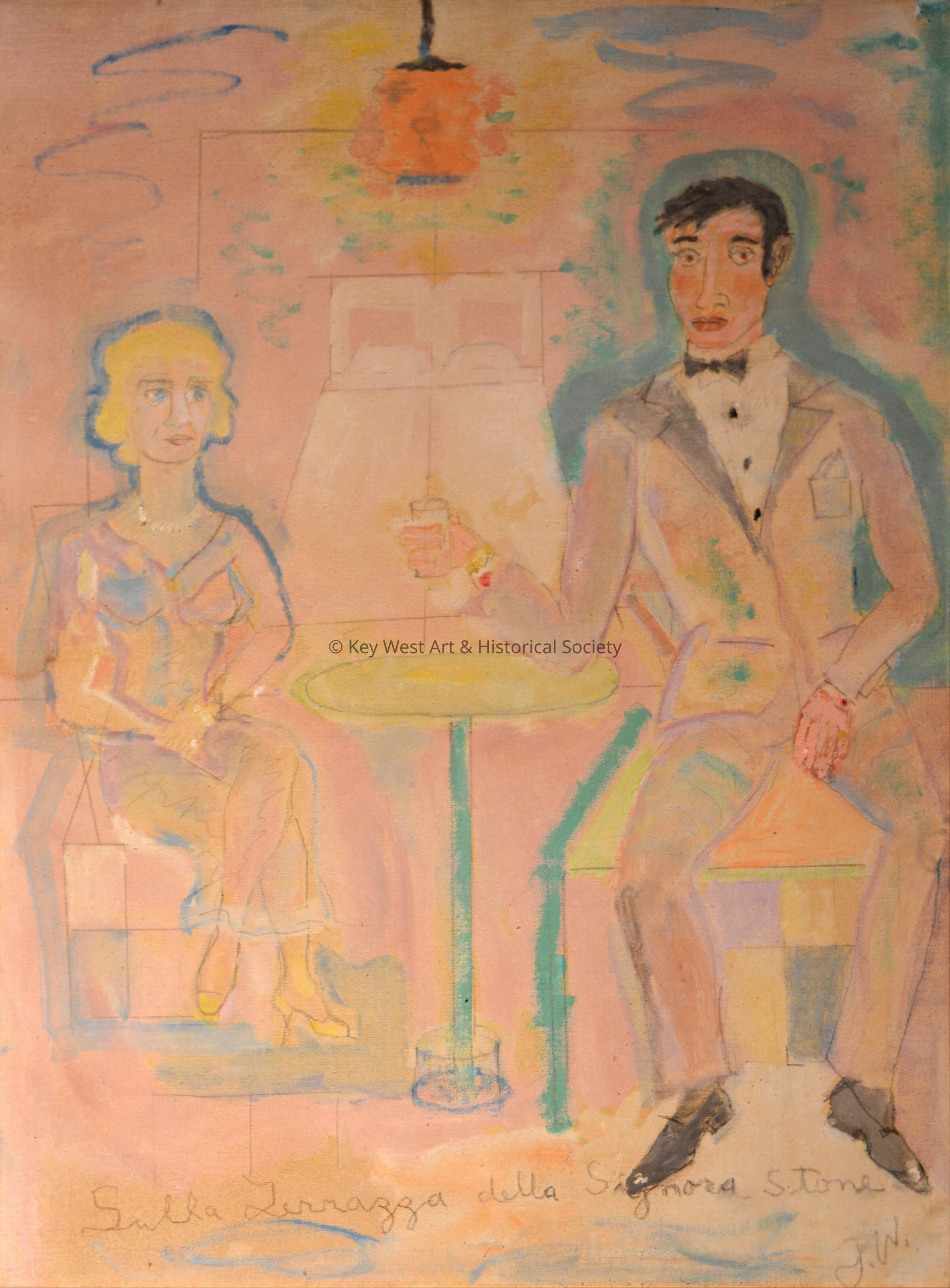 Oil and pencil on canvas board by Tennessee Williams depicting a scene from his first novel, 'The Roman Spring of Mrs. Stone', published in 1950. It tells the story of an aging American actress who travels to Rome, installs herself in a luxury apartment and becomes involved with an Italian gigolo named Paolo. Here, Williams imagines Mrs. Stone with her lover on the terrace of her apartment.Type of Painting