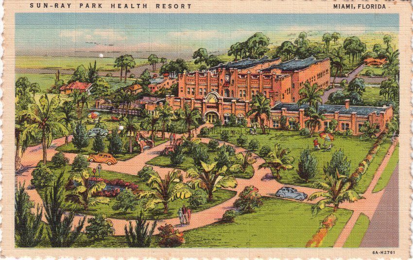 Postcard depicting a hotel in Miami. The caption reads, ‘Sun-Ray Park Health Resort, Miami, Florida.’ Notation on verso reads, ‘Sun-Ray Park Health Resort, W. Flagler Street at 30th, Miami, Florida. American Plan Hotel; Approved Sanitarium. Special Facilities for Rest, Convalescence, Chronic Cases. Located in beautiful tropical grove in highest part of Miami. Luxurious comfort, excellent cuisine. Resident physician, trained nurses, attendants, dietitian. 30 treatment rooms, sun terraces, baths, massage, colon irrigations and other approved physical therapy.’Subject Place