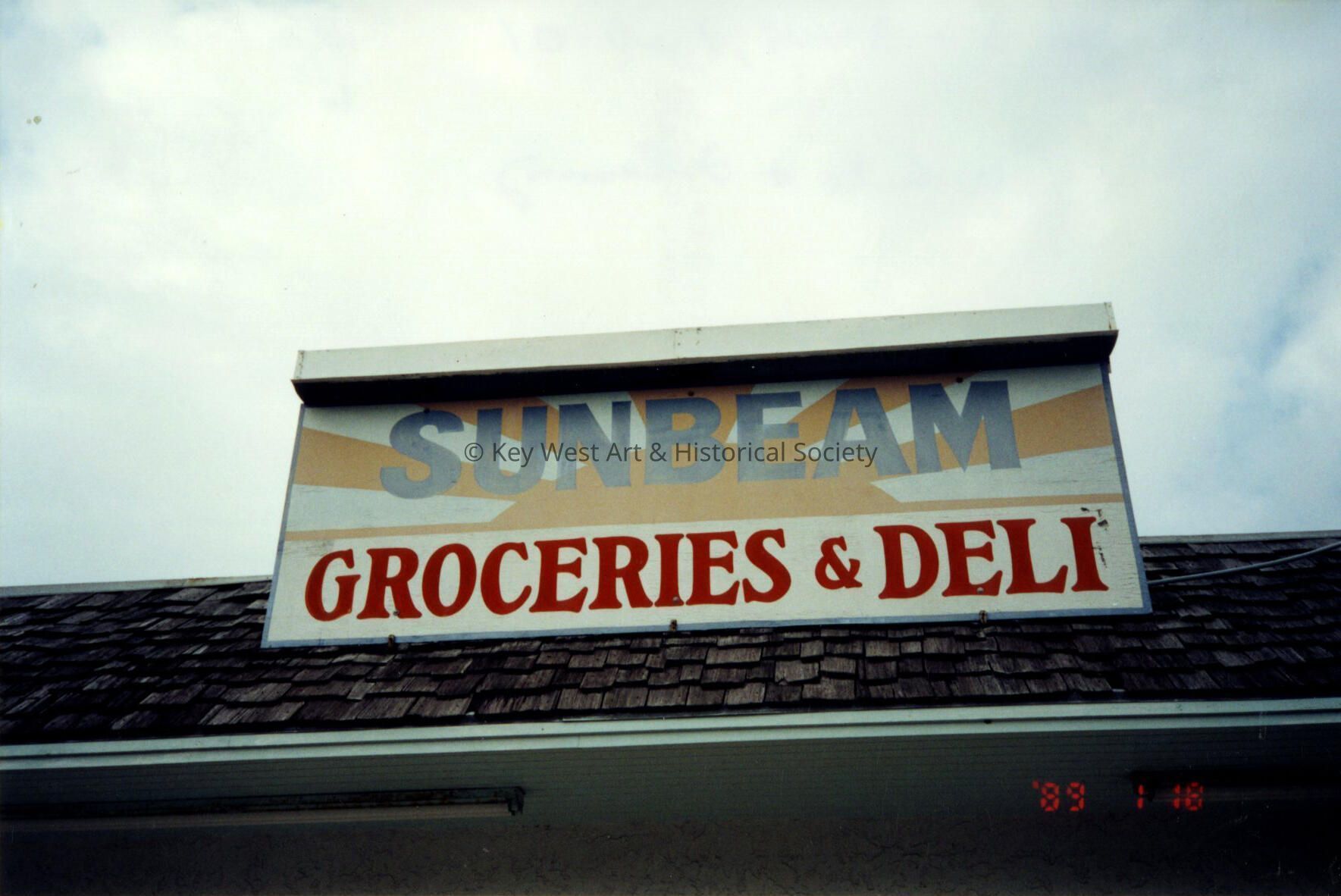 Color photograph taken by historian James M. Goode of the Sunbeam Groceries & Deli sign at 500 White Street during a trip to Key West in February 2001. Printed from Roll 3.