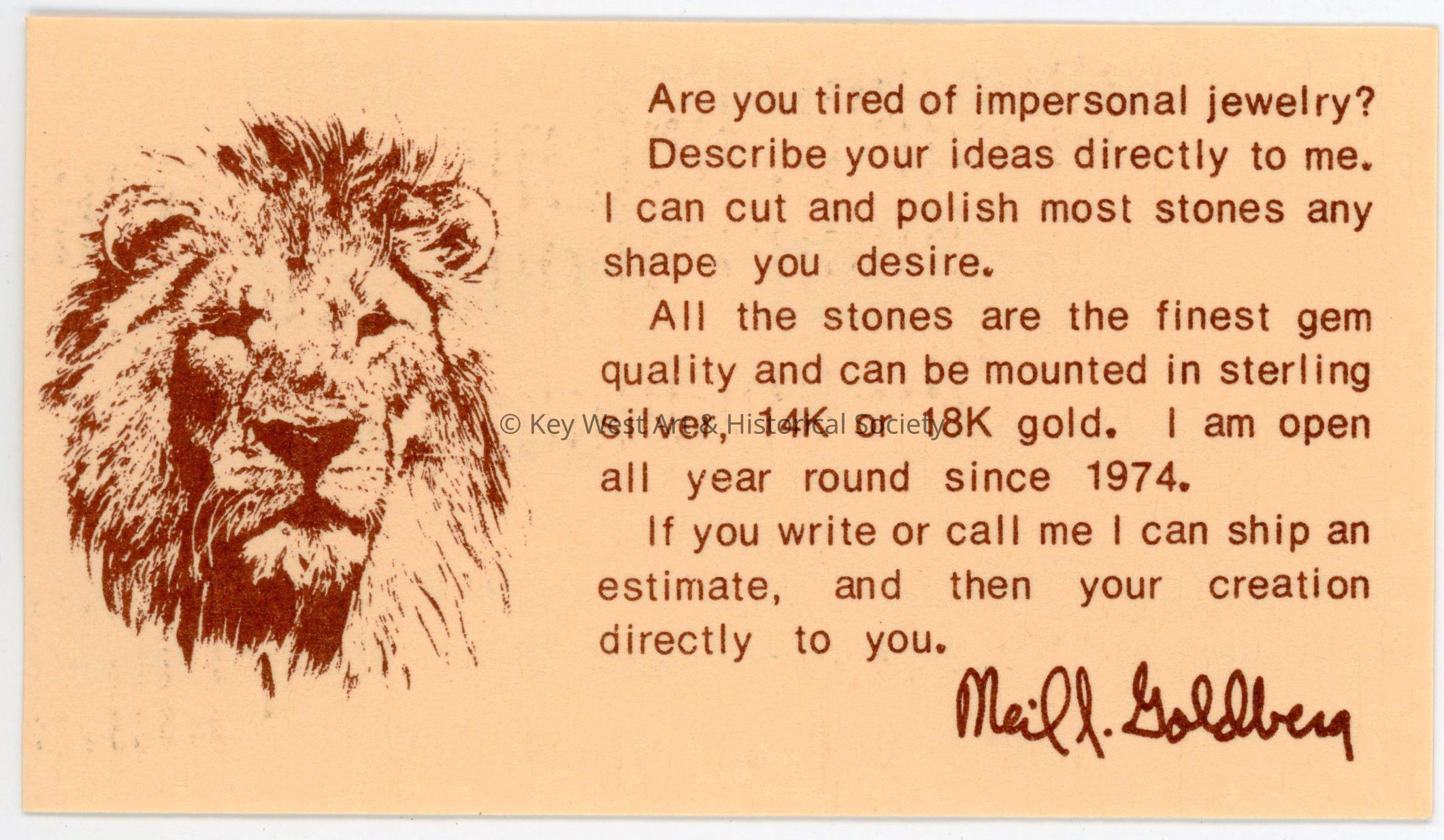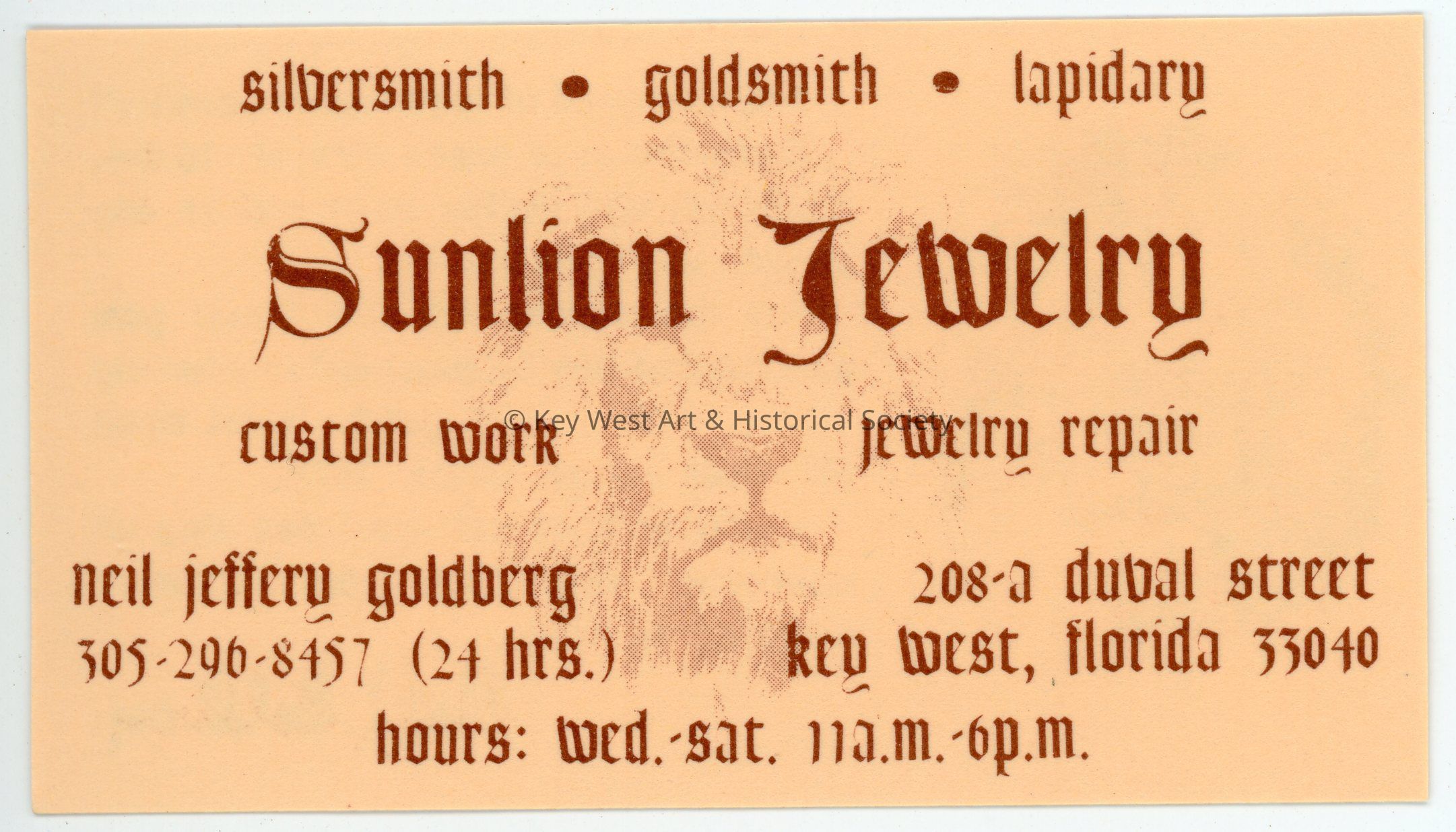 A business card for Sunlion Jewelry formerly located at 208-A Duval Street. Operated by Neil Jeffery Goldberg, the business made custom jewelry as well as conducted repairs.